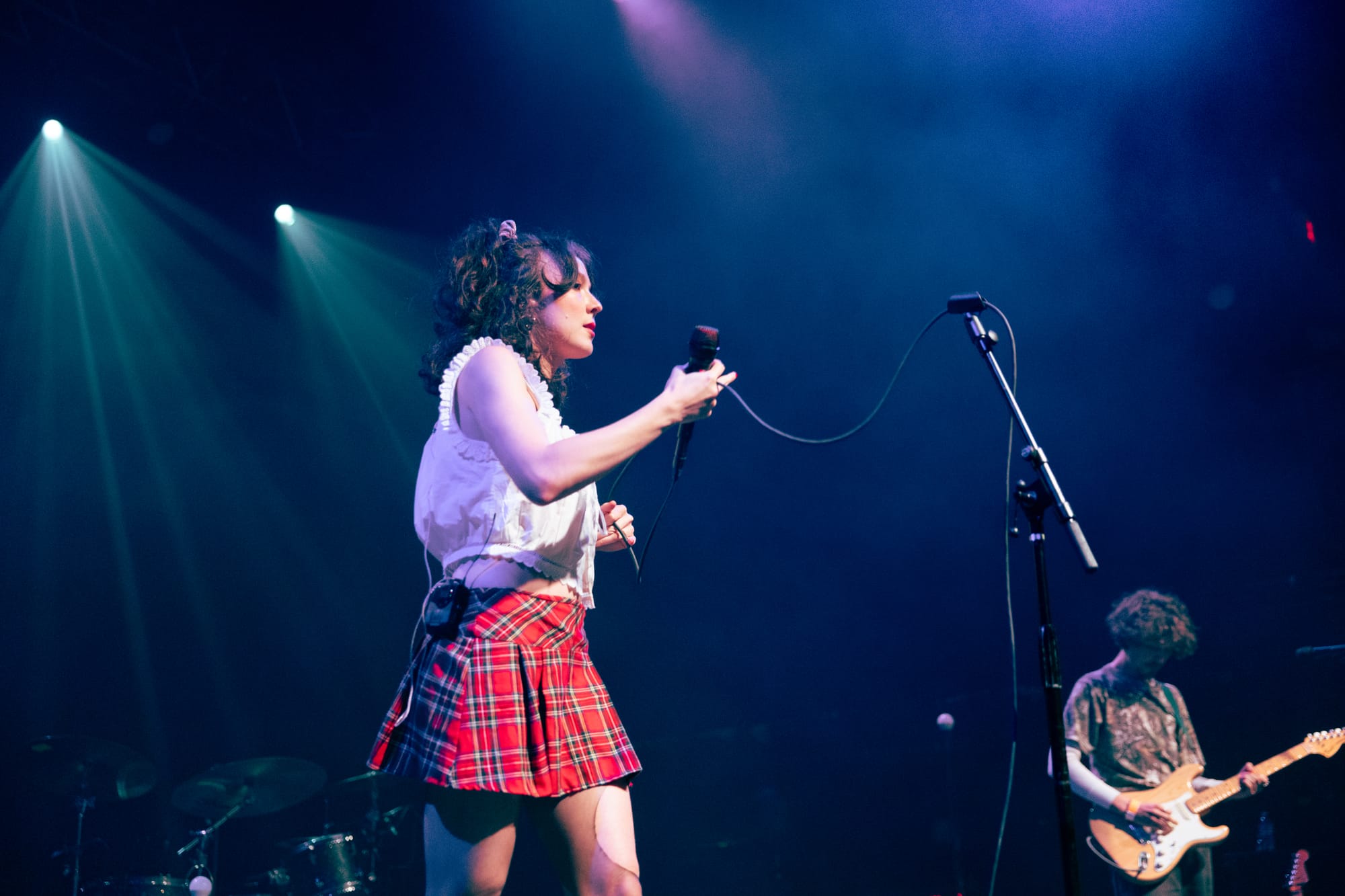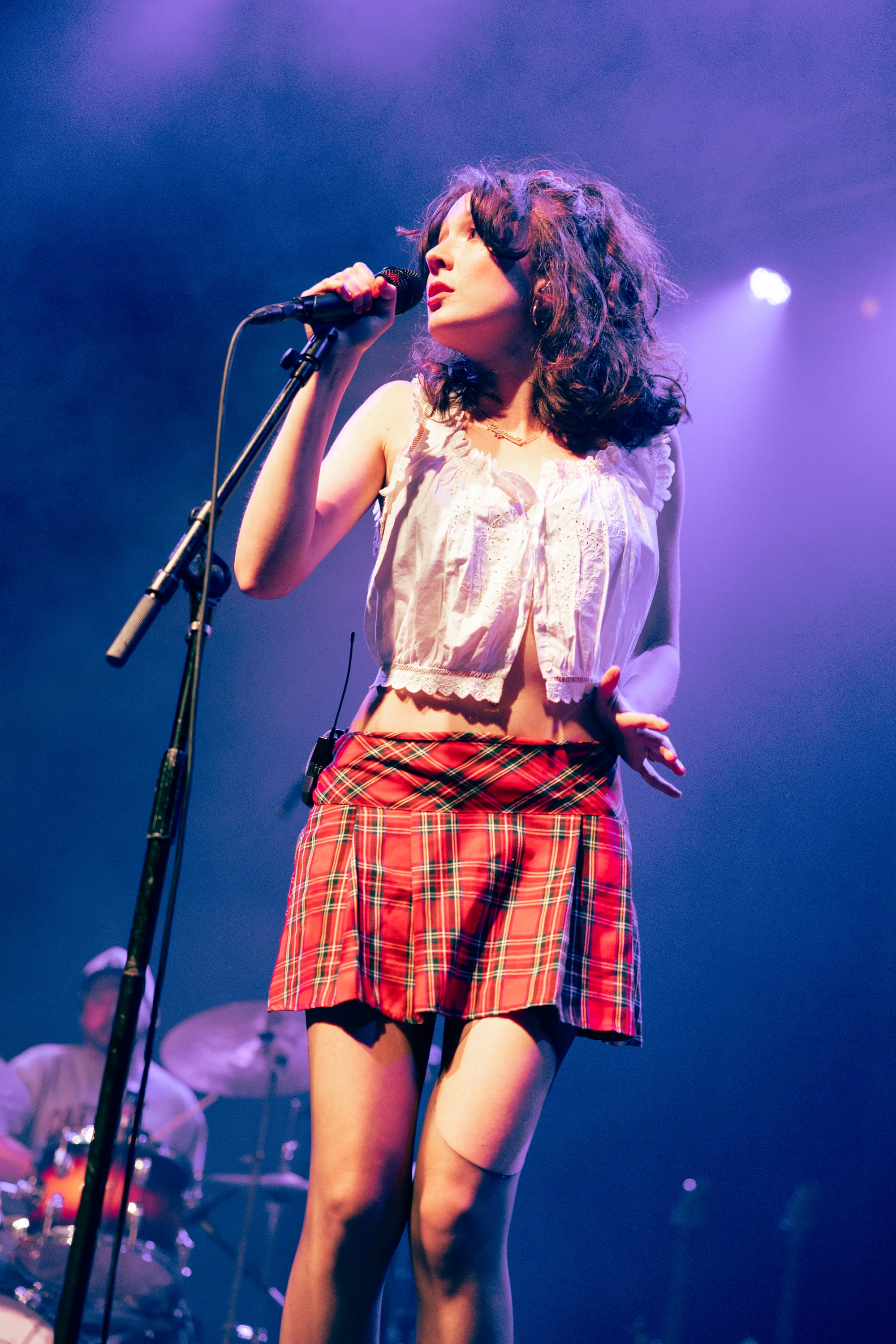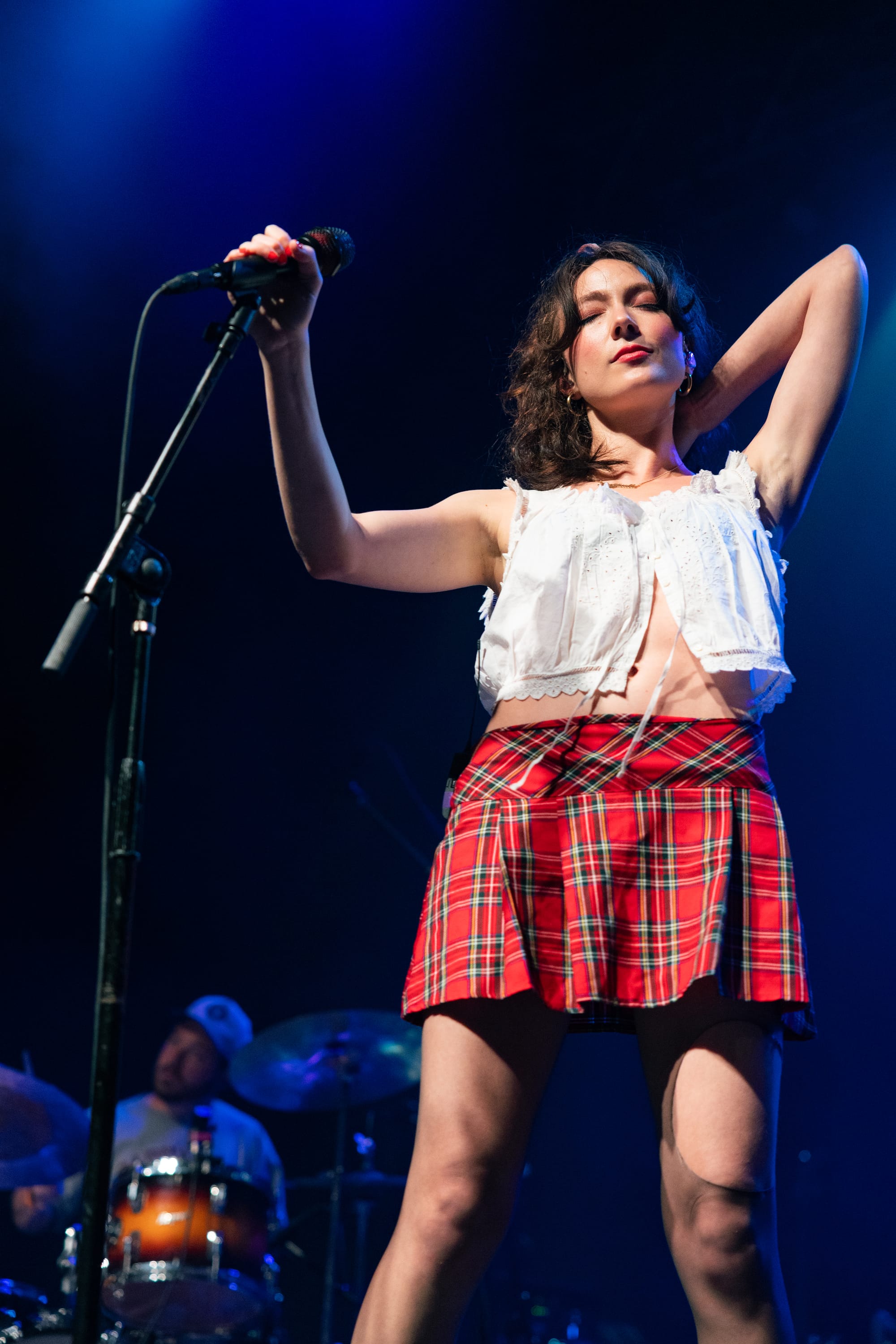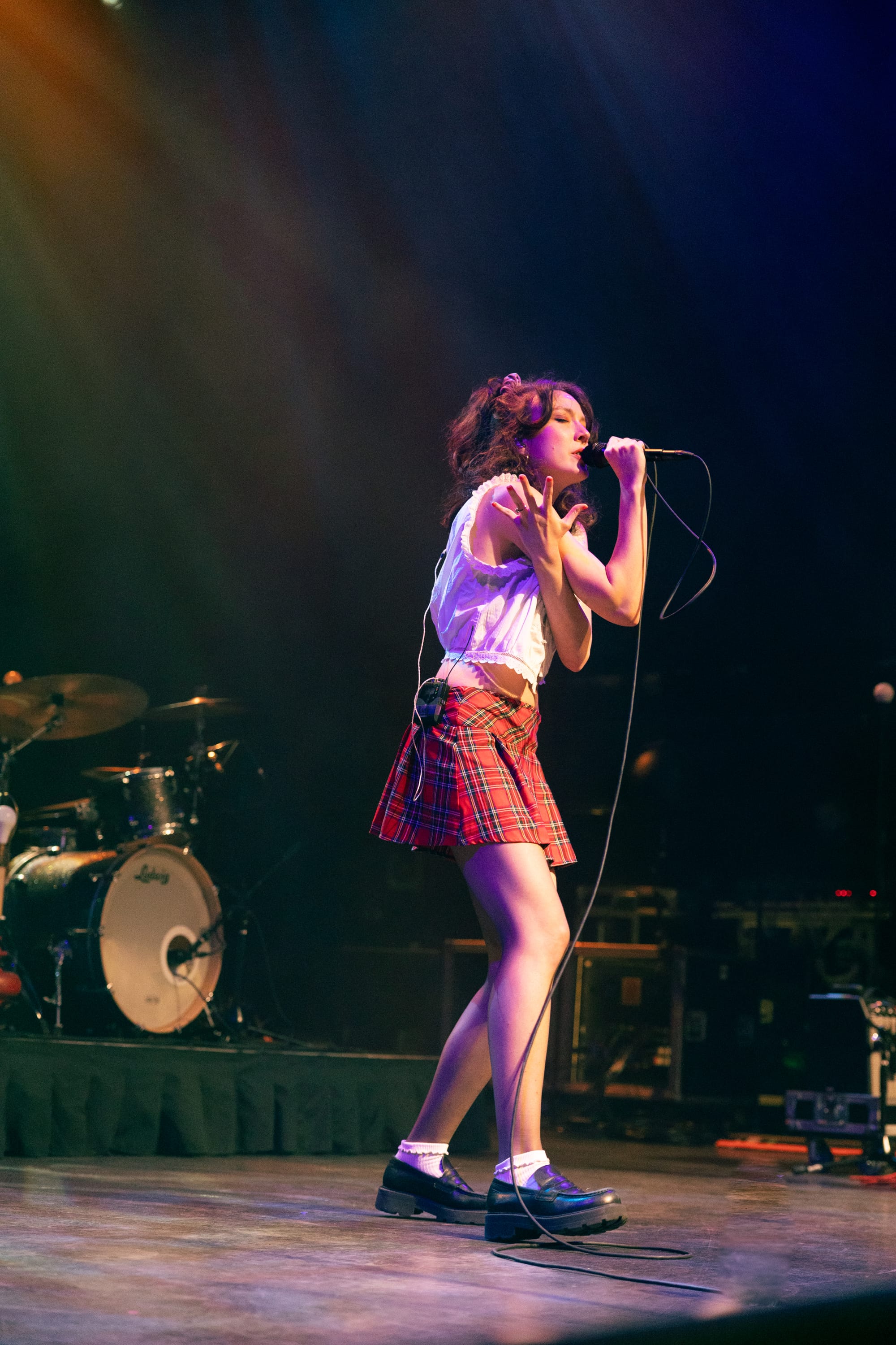 The show began with Raffaella, who set the enchanting tone for the night. She skipped out in a plaid pleated skirt, white frilly blouse, ripped tights, and sleek black loafers. Her half-up, half-down hairstyle bounced as she tiptoed around the stage and laid on her stomach to kick her feet back and forth during the standout track "BUICK." She performed a variety of catchy and thought-provoking tracks, using these expressive dances to highlight the layered production. Her humorous and personable anecdotes fostered an intimate connection with the audience. She revealed that she felt like she was "meeting a celebrity geographically speaking" by being in Boston because she had been watching a lot of Cheers, pointed out the irony of Emily Dickinson's last name, and cited Samia as the inspiration for a song about how she is fiercely loyal when it comes to her best friends.