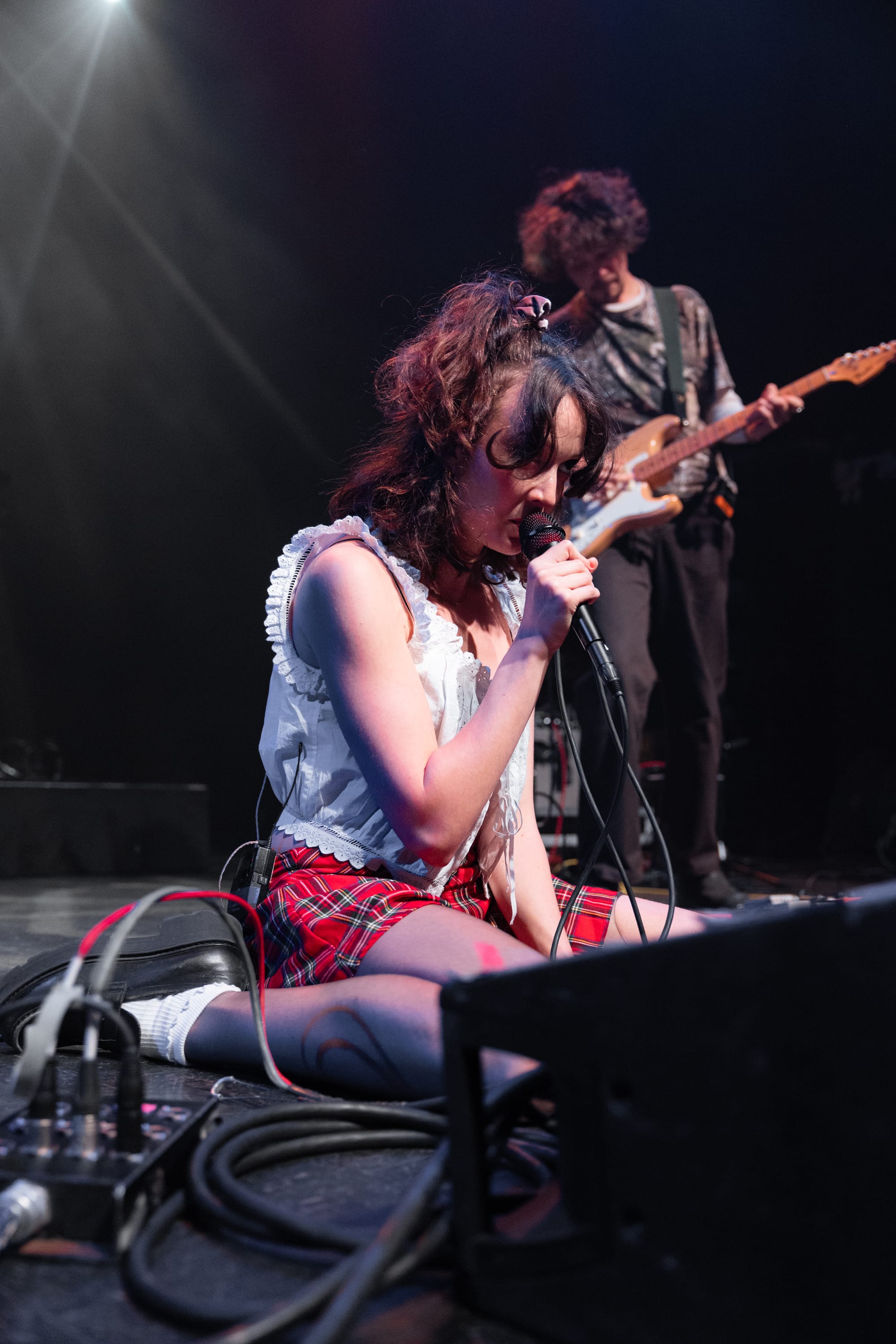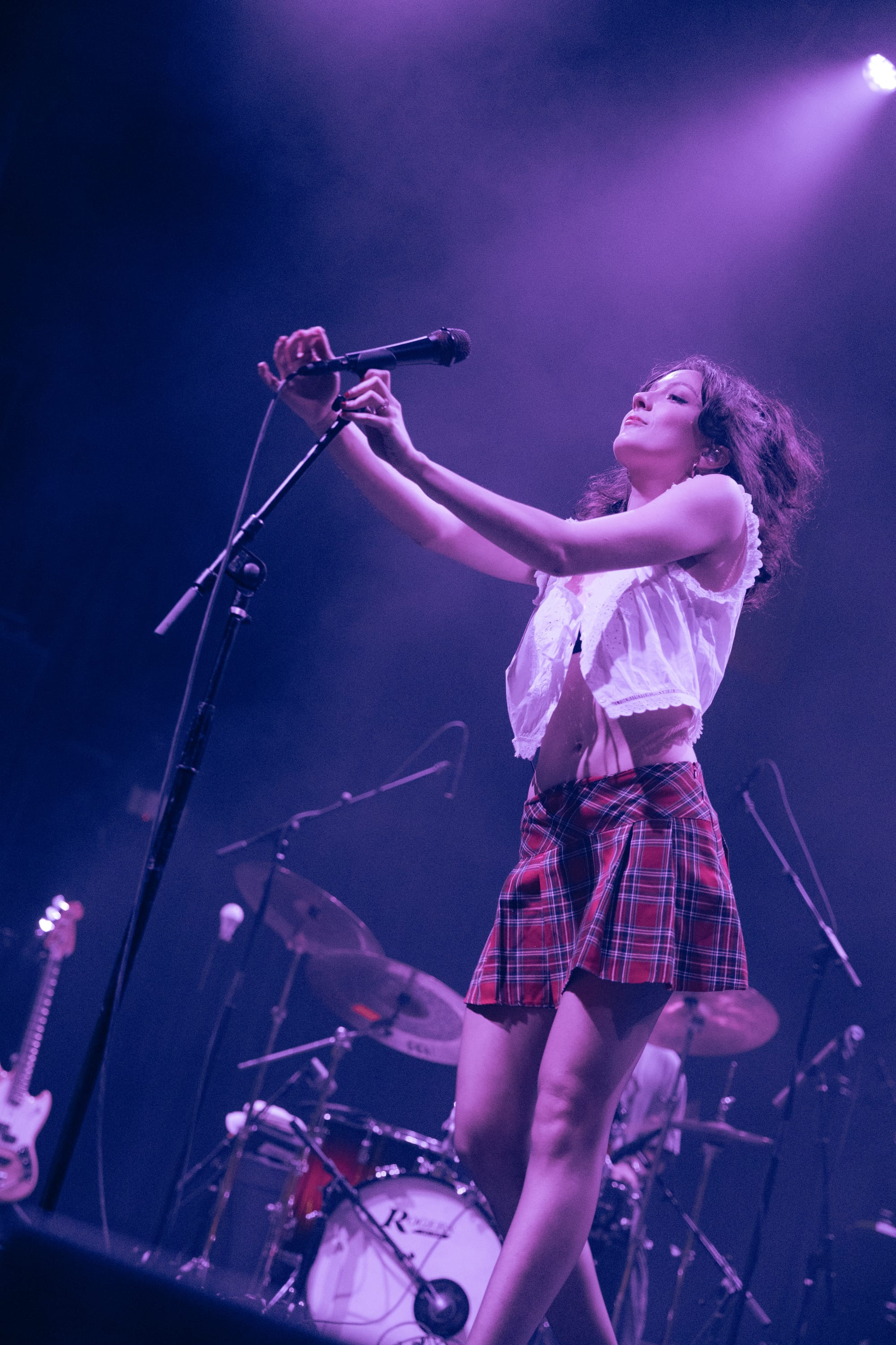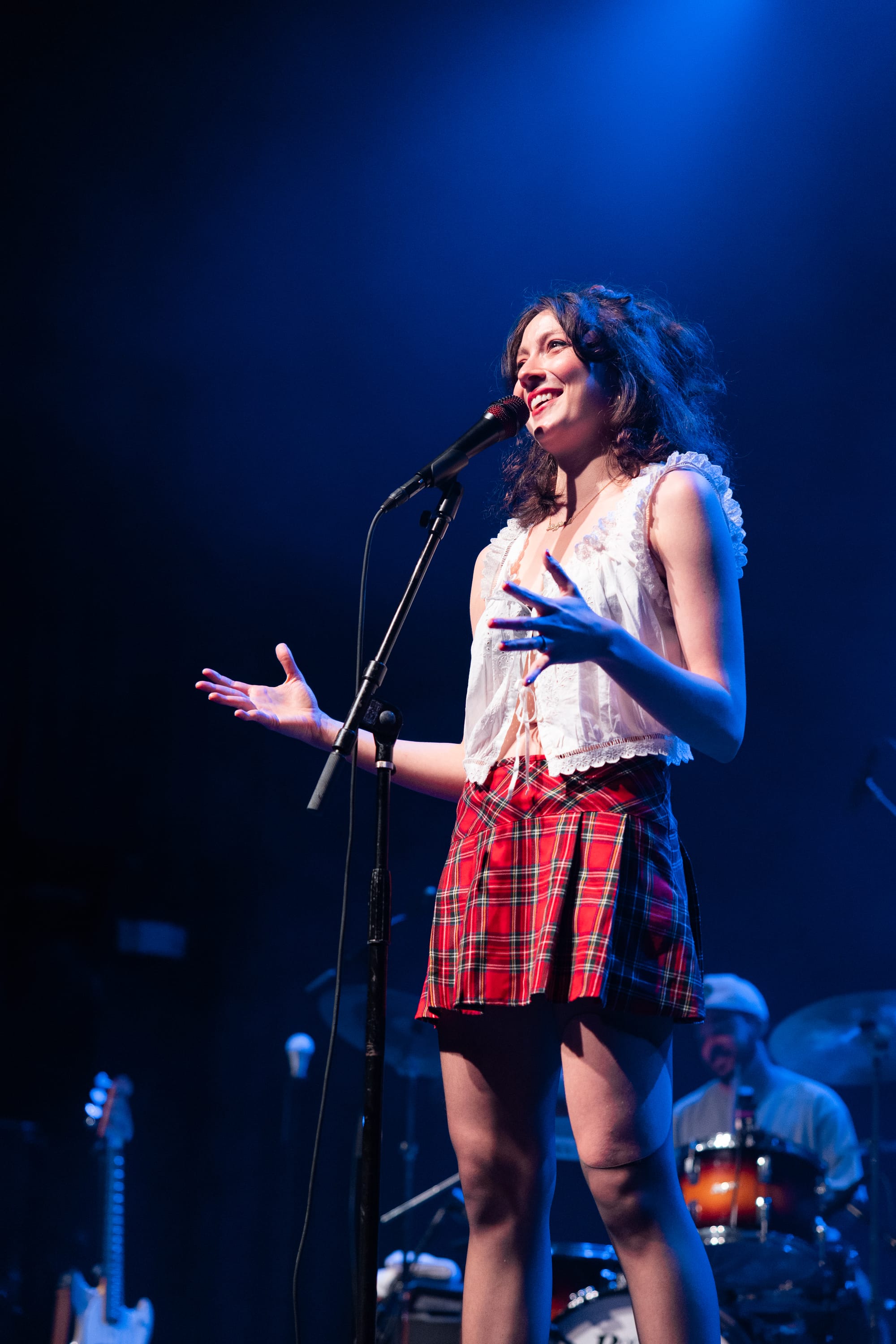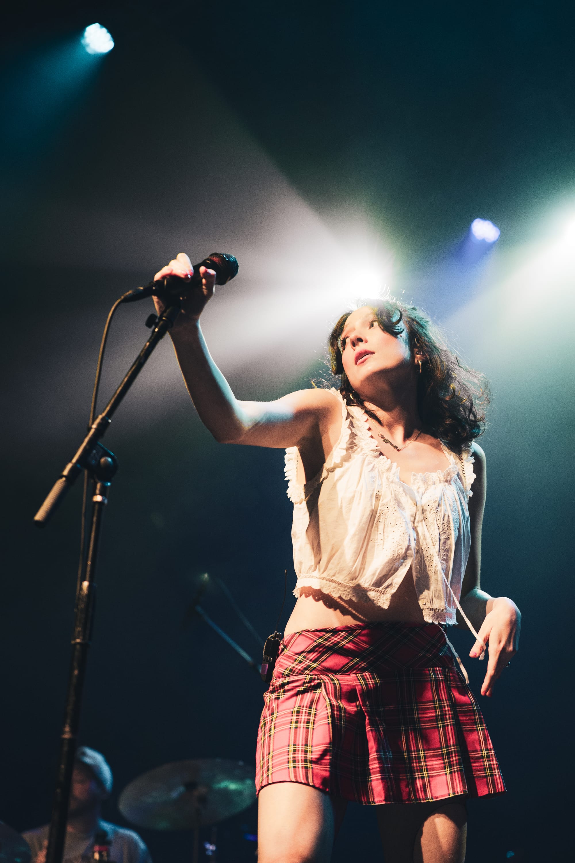 The show began with Raffaella, who set the enchanting tone for the night. She skipped out in a plaid pleated skirt, white frilly blouse, ripped tights, and sleek black loafers. Her half-up, half-down hairstyle bounced as she tiptoed around the stage and laid on her stomach to kick her feet back and forth during the standout track "BUICK." She performed a variety of catchy and thought-provoking tracks, using these expressive dances to highlight the layered production. Her humorous and personable anecdotes fostered an intimate connection with the audience. She revealed that she felt like she was "meeting a celebrity geographically speaking" by being in Boston because she had been watching a lot of Cheers, pointed out the irony of Emily Dickinson's last name, and cited Samia as the inspiration for a song about how she is fiercely loyal when it comes to her best friends.