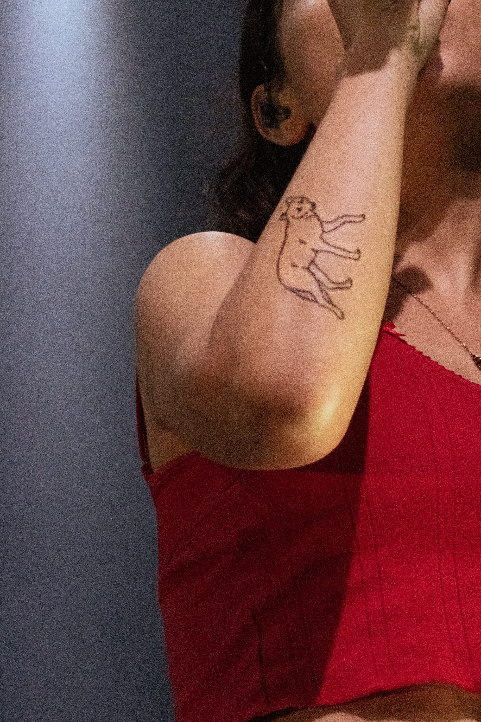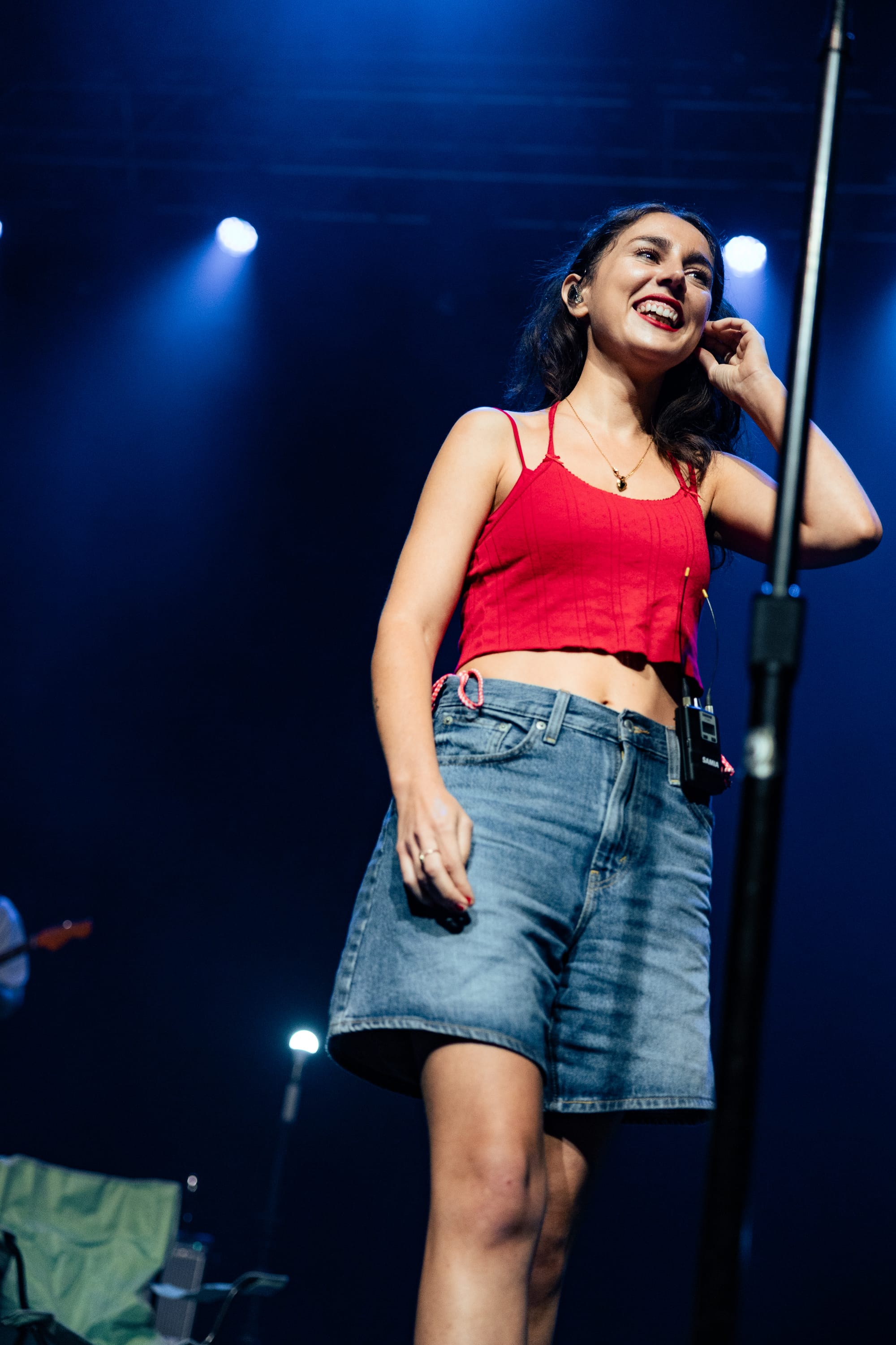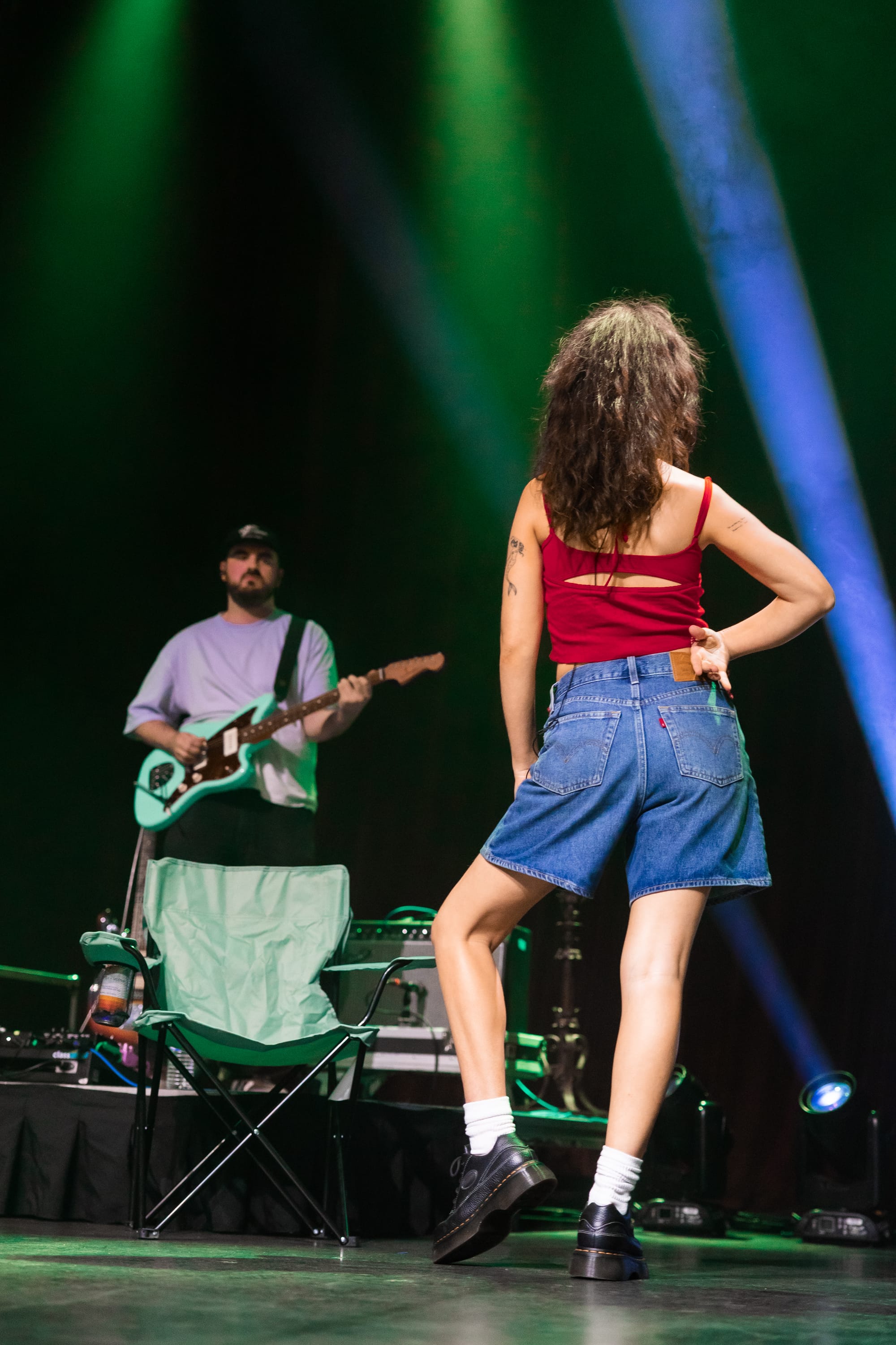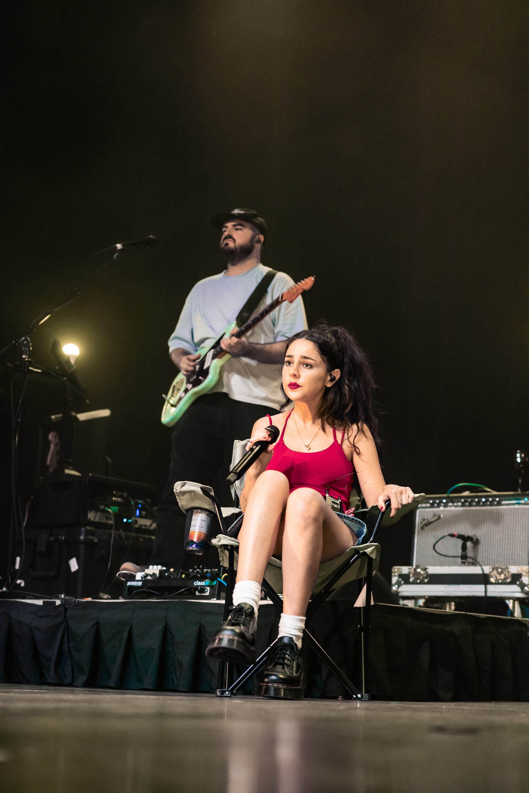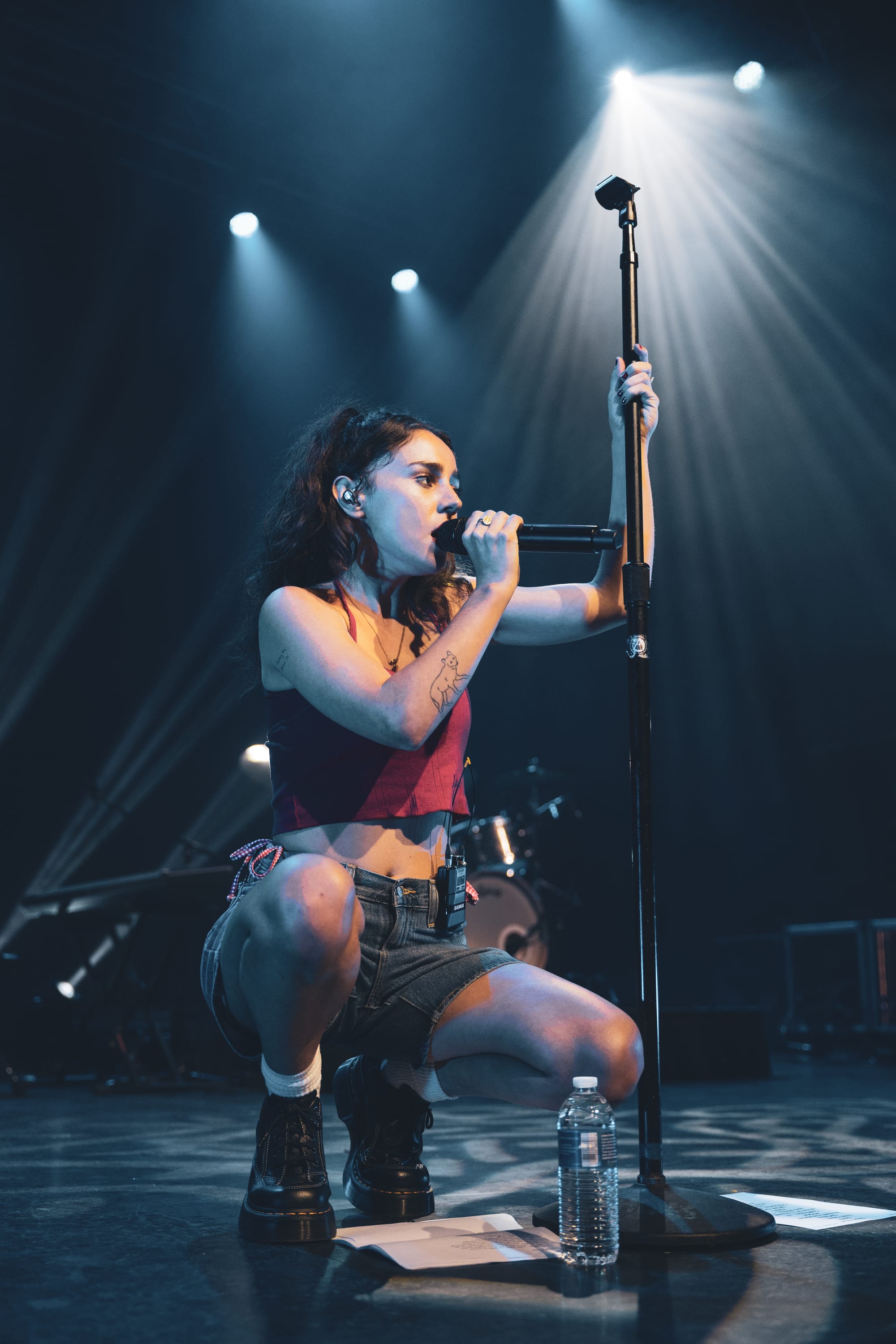 The singer's visceral music confronts complex topics like societal expectations, femininity, emptiness, and identity, translating to a live show that inspired audiences to face them confidently, too. During "Sacred," she sat on the floor and dangled her legs over the stage, creating a strong bond with the audience by matching their eye level. The stage design mirrored the album's themes, with a few bare bulb light stands flashing to the beat and a navy green lawn chair Samia would occasionally sit on. During "Fair Game," she sang about how killing mosquitoes is a lost cause, "You can go outside on a hot night and clap / But you won't get your blood back," while sitting in the chair, a common scene for this existential bug-related crime. She held the crowd in the palm of her hand, with fans cheering when they identified the start of the next song as if each one was their favorite. She used dynamic and jerky movements to highlight the sharp instrumentation from her band, feeding off their energy (see the gif below).