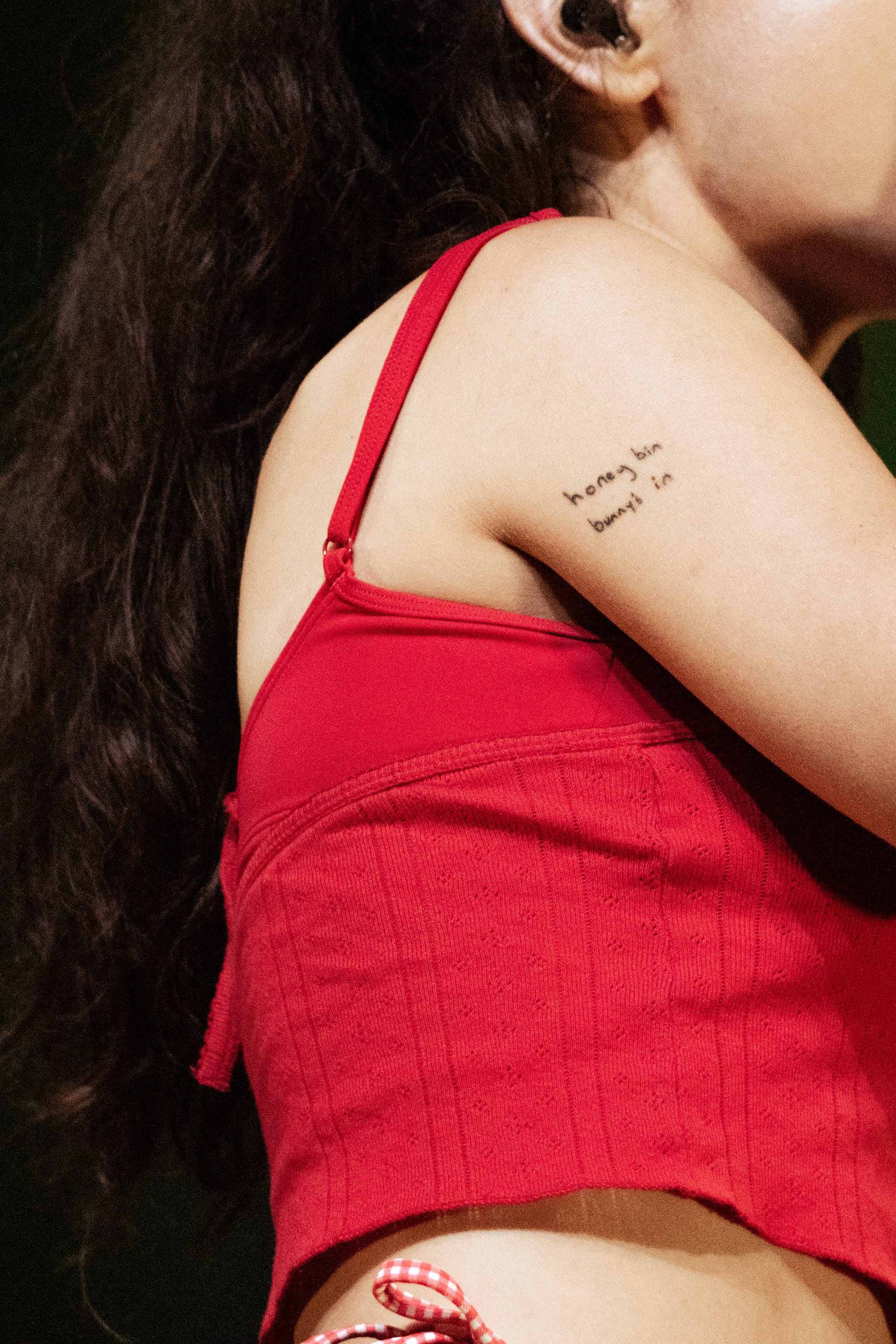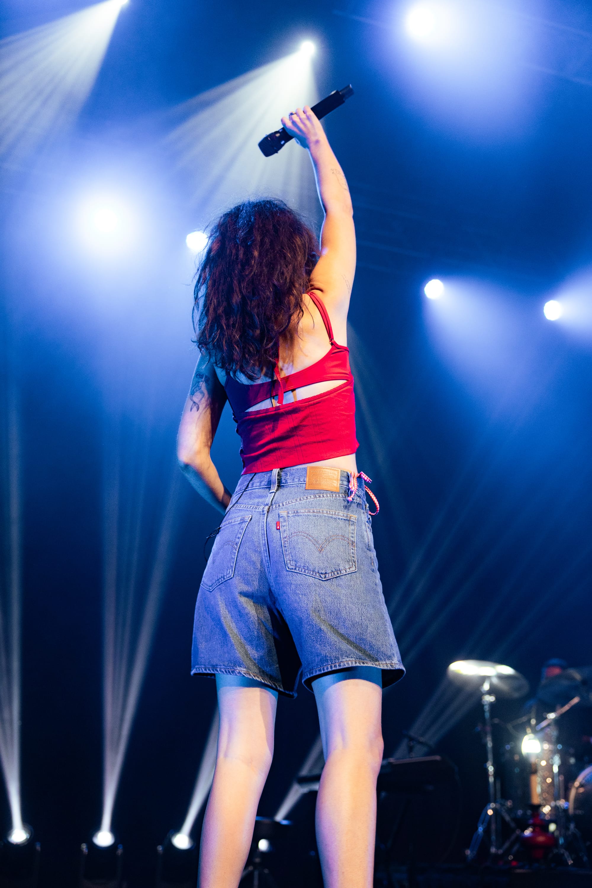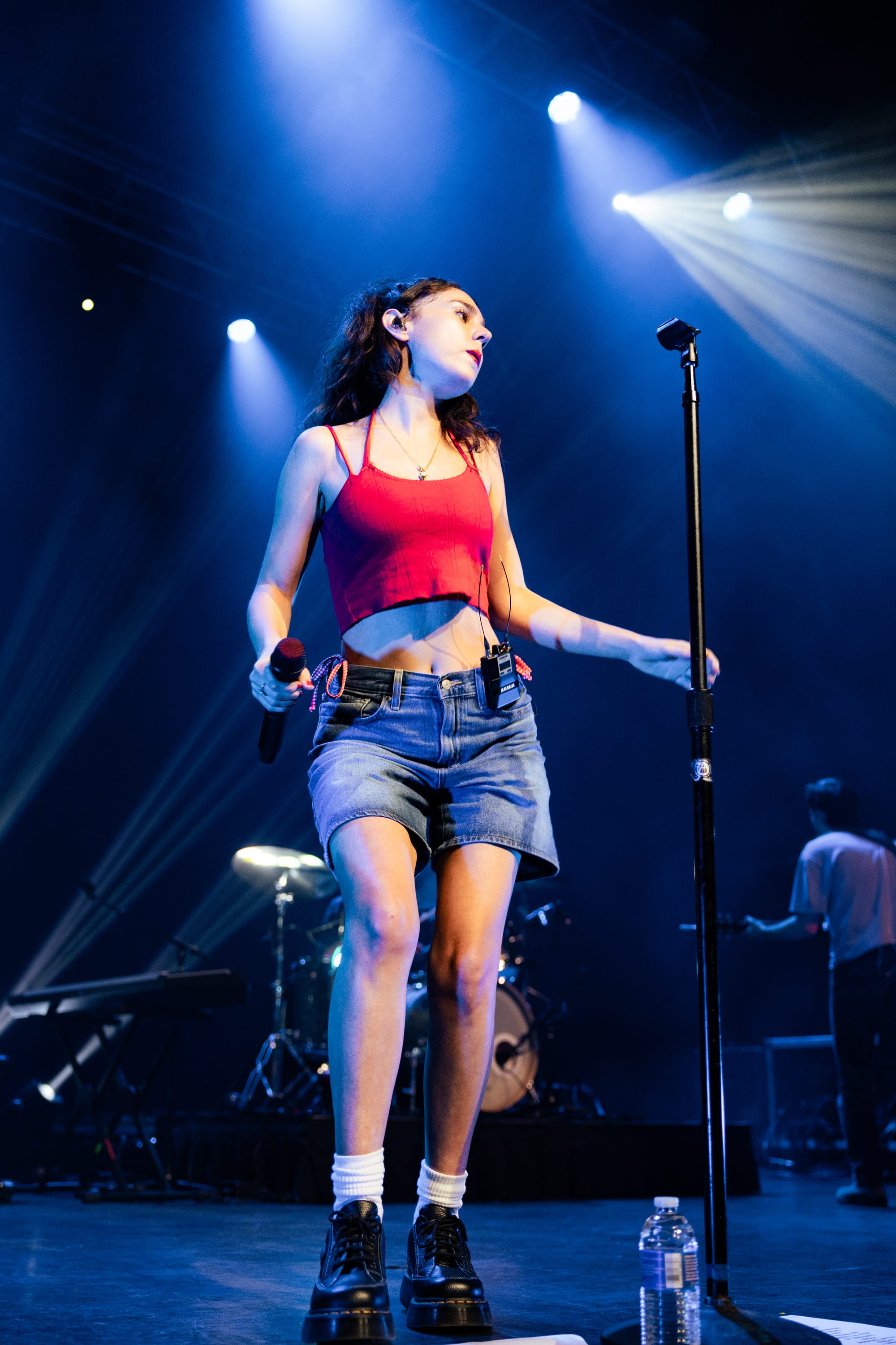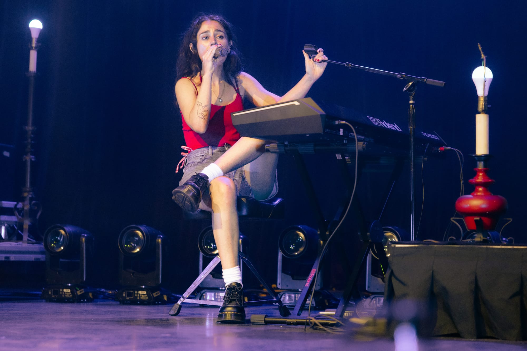 Soon after, Samia's voice came across the speakers to urge everyone to donate to Reproductive Freedom For All, revealing one lucky fan who texted the number would win a signed setlist. The lights dimmed, and the band took their places on stage, some carrying classy wine glasses to their spots. Samia emerged in a tomato-red camisole and mom shorts. She kickstarted her set with "Triptych" from her 2020 debut album, The Baby, holding onto the mic stand while taking in the scene. Samia was a woman of few words, but her genuine gratitude and surprise spoke volumes. She shared that she appreciated the "overwhelming love" in the room and lost herself in the excitement, laughing as she ran to the piano after almost missing her queue.