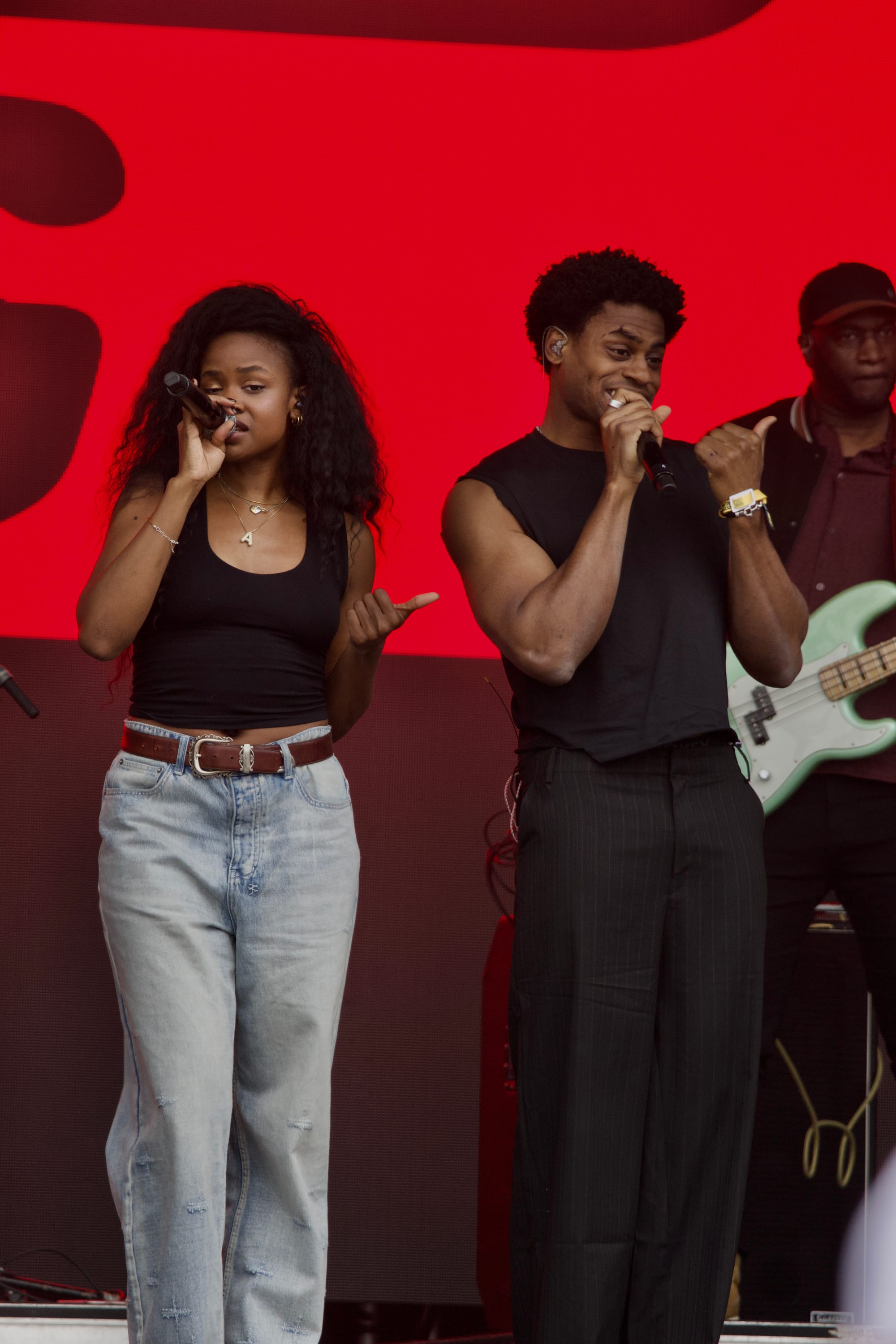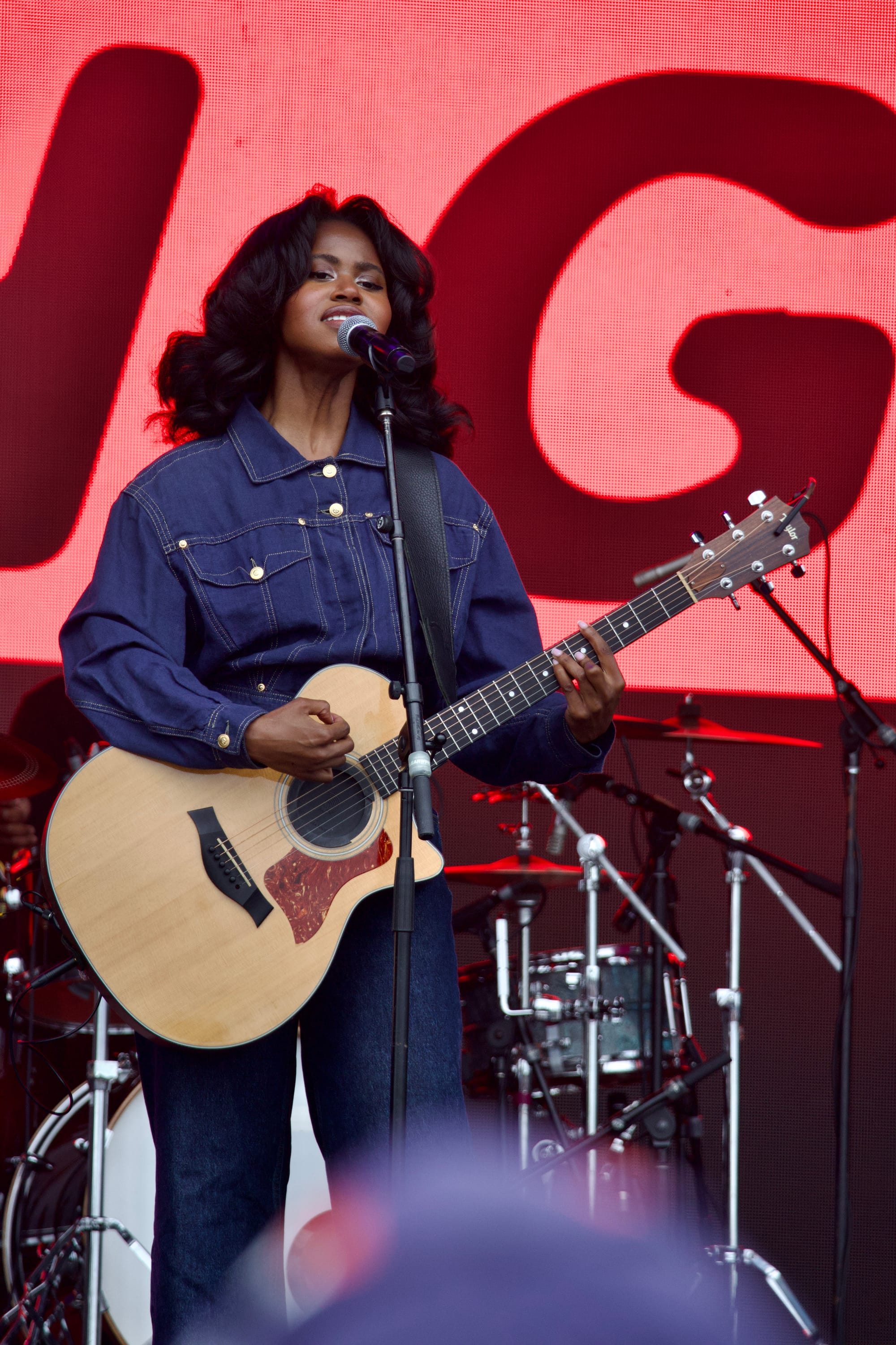 Small but mighty country star Megan Moroney took the first headline spot on the Green Stage. She wore a beautiful white suede coat with feather cuffs around the sleeves, smiling from ear to ear. During songs like "Tennessee Orange," a track about wearing a different team's colors after falling in love with someone from another state, she removed her coat to reveal a custom Red Sox jersey underneath. The royal blue on her bedazzled mic stand contrasted nicely with the pop of red on her regal strapless dress. Sparkling royal blue cloud visuals made the crowd feel as though they were floating with her as she ascended a staircase to the middle of the stage. She closed her set with the breakout hit "Am I Okay?" twirling through the rain.