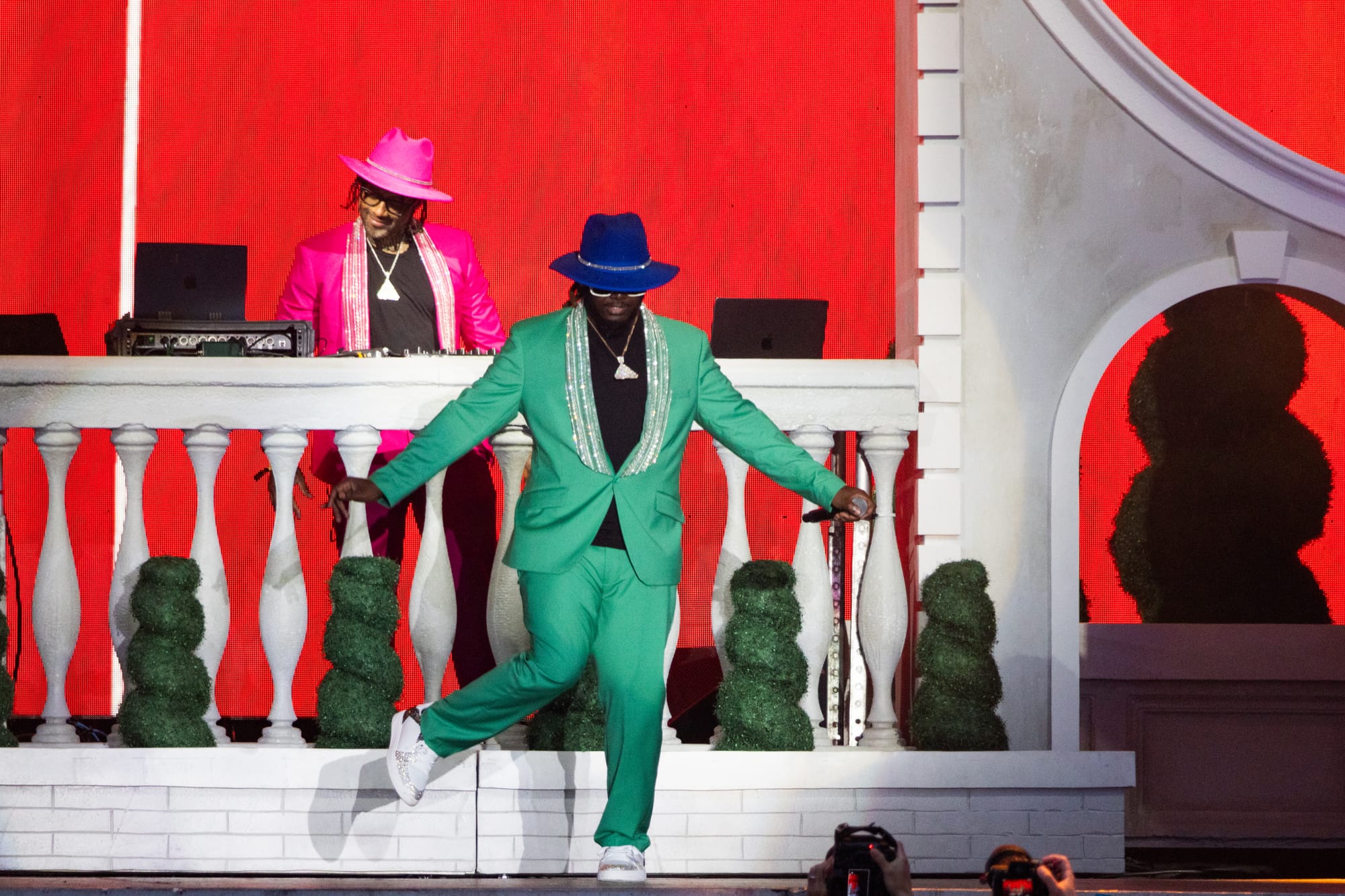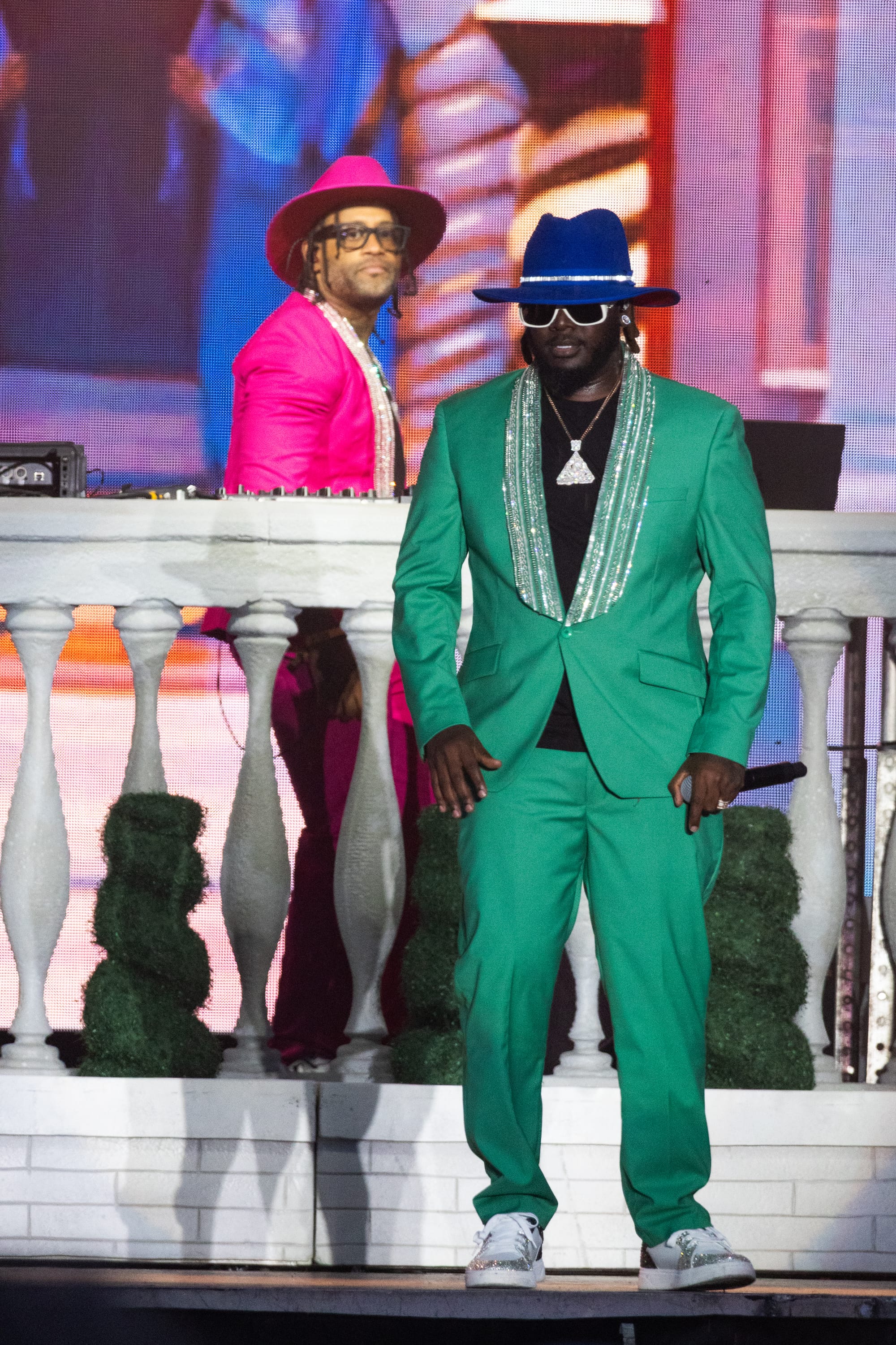 During his headline set, hip-hop legend T-Pain drew in one of the largest Allianz Blue Stage crowds in recent memory. He brought along marble-esque set pieces, such as columns with arches that housed the DJ booth and larger-than-life statues of himself surrounded by twisting shrubbery. He emerged in a sleek green suit with rhinestoned lapels, sharing he had to make sure everything was "zhuzhed up" for Boston. Fans were glued to the stage as he danced and jumped in front of a backdrop of firework visuals. He was in constant motion the entire set, twerking and doing the wave whenever possible.