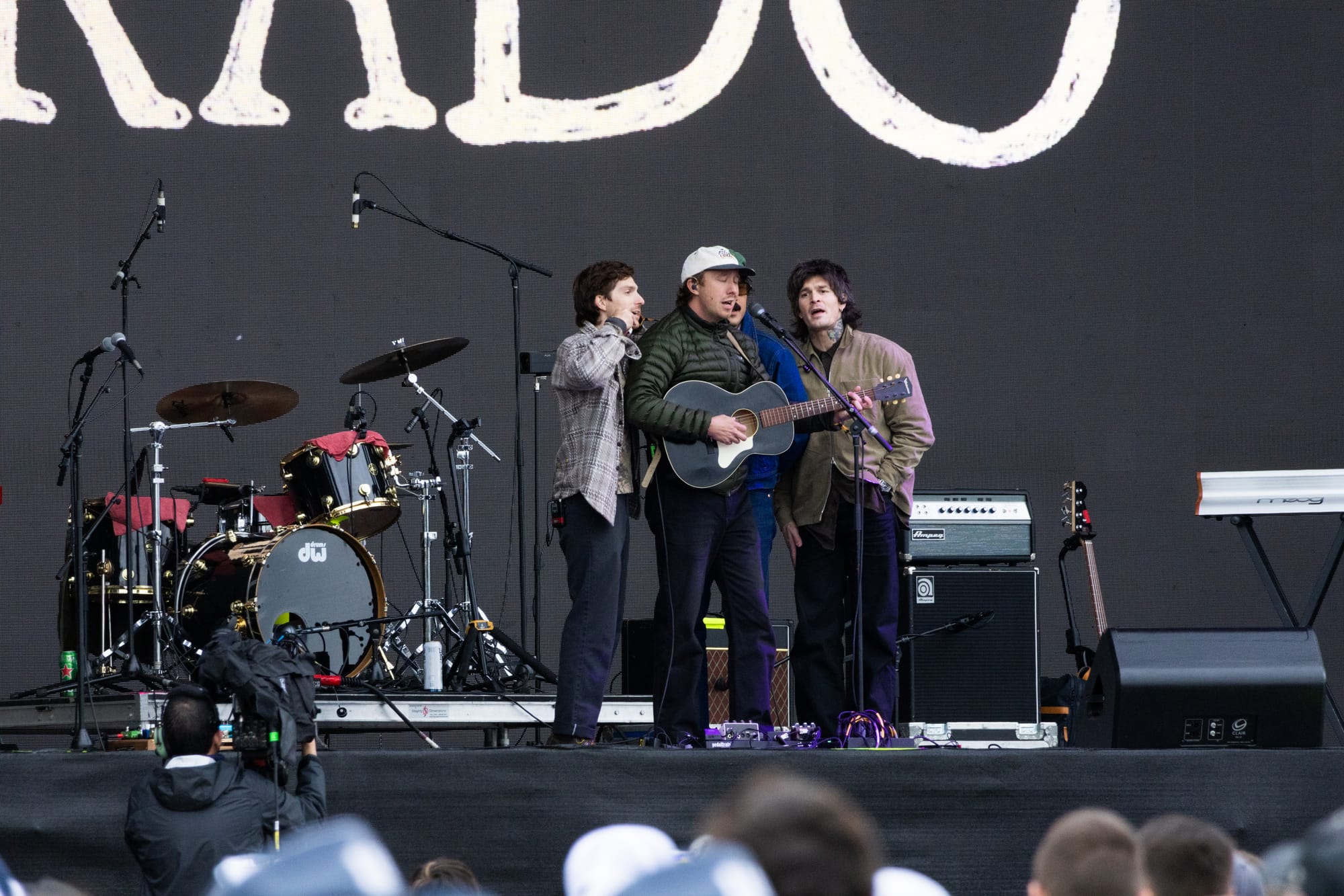 Indie-folk band Wilderado brought a southern flair to their set on the Green Stage. The Tulsa, Oklahoma natives bundled up in flannels and puffy coats gathered around one mic to sing together during songs like "Surefire." They kept sharing how playing at Boston Calling was a dream come true for them, making the moment even more special. Before escaping backstage, frontman Max Rainer dipped down to the barricade to sign some albums and snag a slice of pizza offered to him by a fan.
