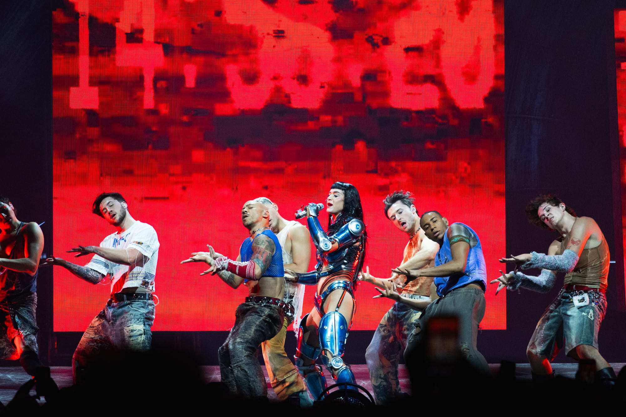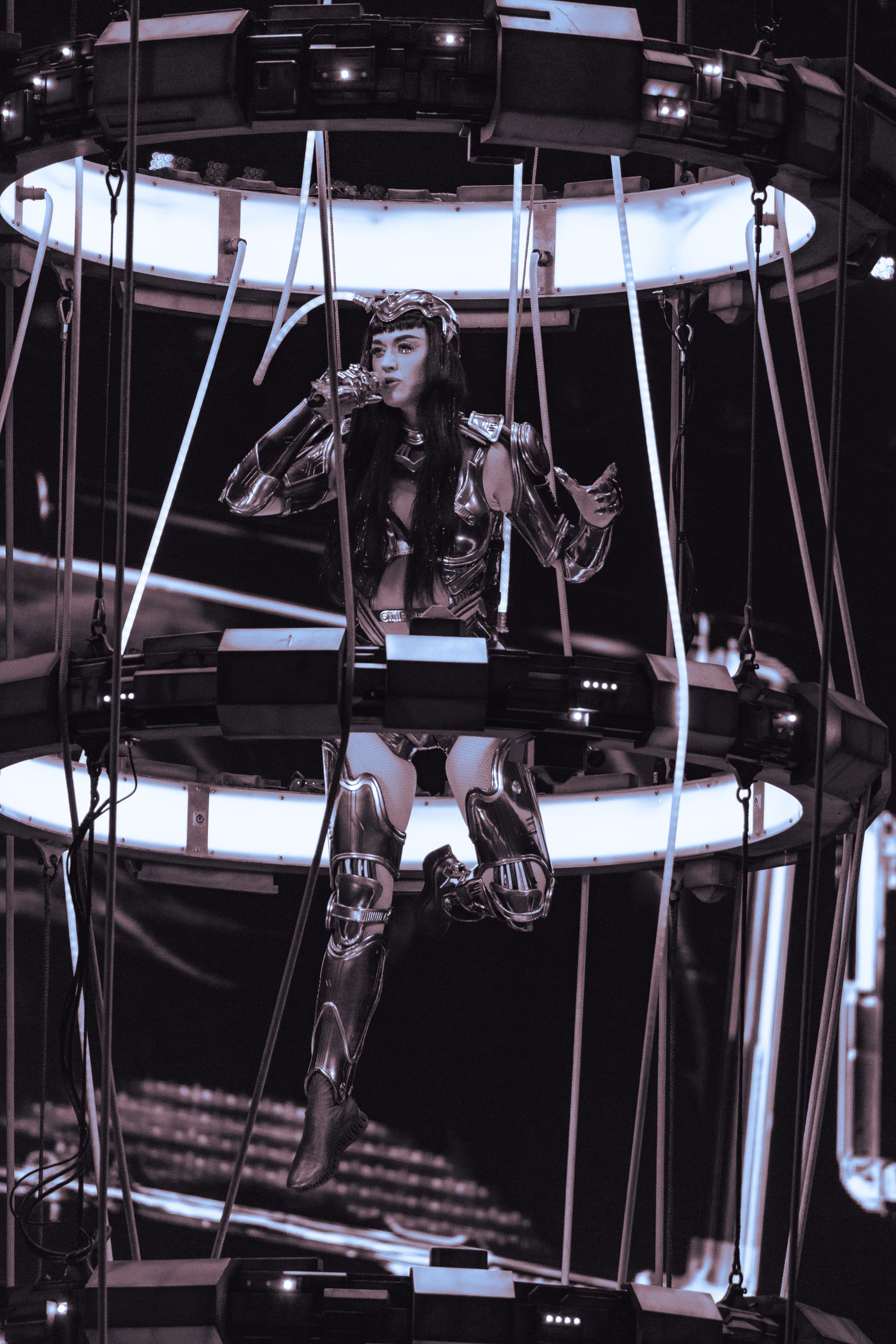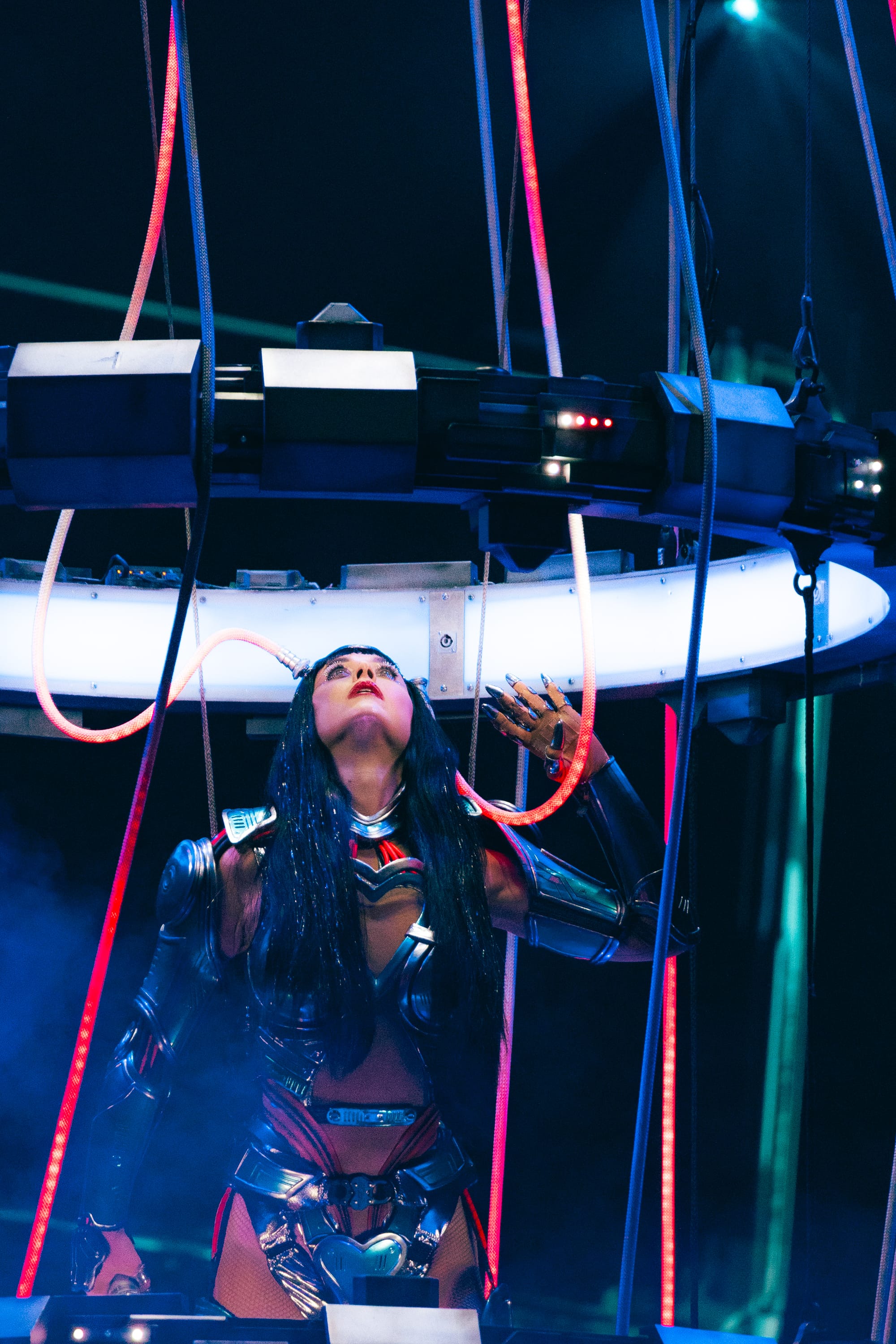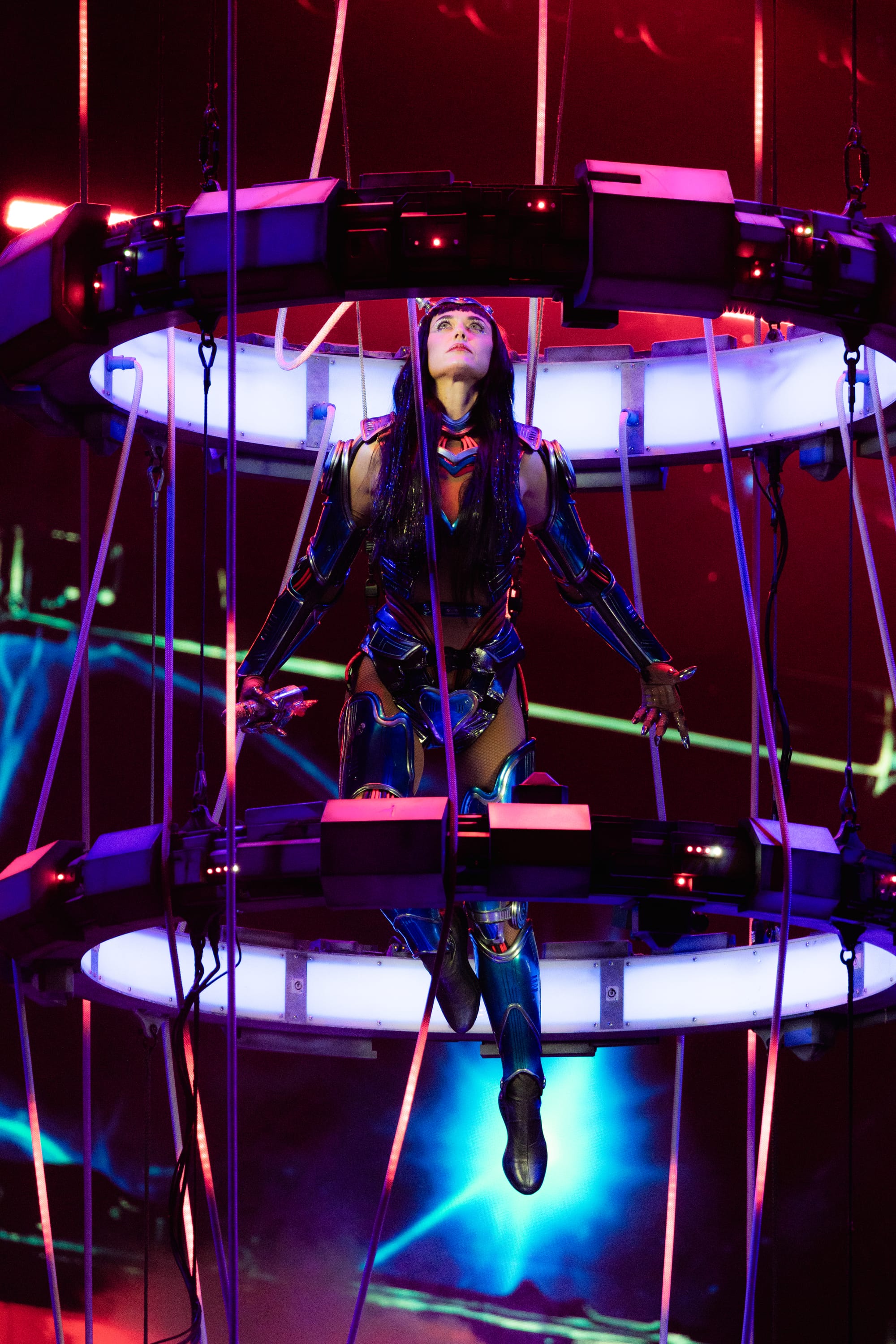 Dancers, dressed in matching cyberpunk outfits adorned with headsets, created dynamic shapes with their sharp arm movements, underscoring the beat. Perry committed to executing death-defying stunts straight out of Cirque du Soleil. She flipped across the venue on a harness to land on giant metal flower petals during "NIRVANA," interacting with fans around the venue and making every seat in the house the best seat. She flew through the sky on a metal butterfly during "Roar," and twirled up toward the ceiling in a metal globe on an aerial rope during "I Kissed A Girl."