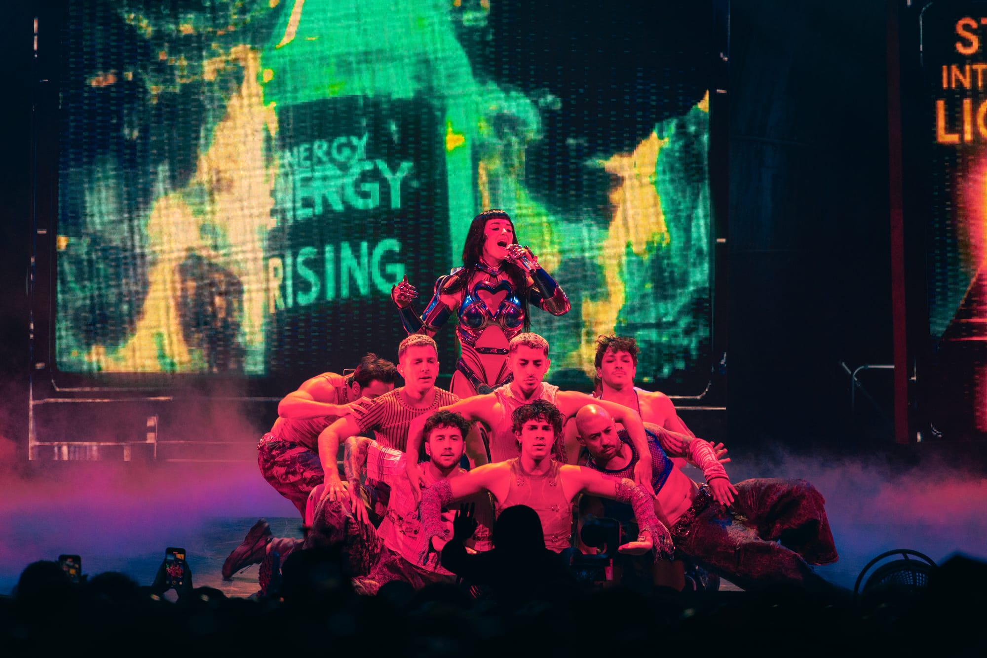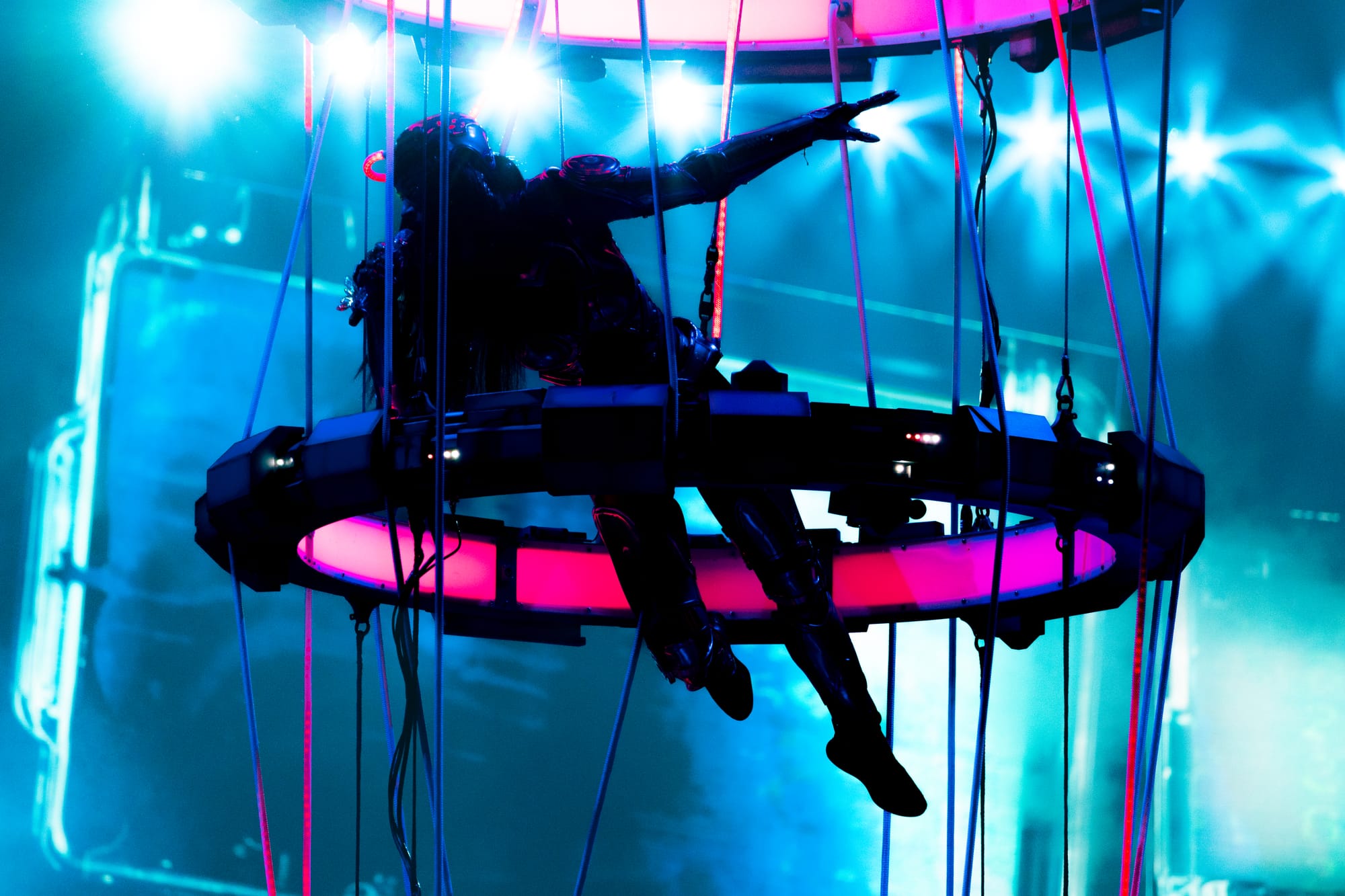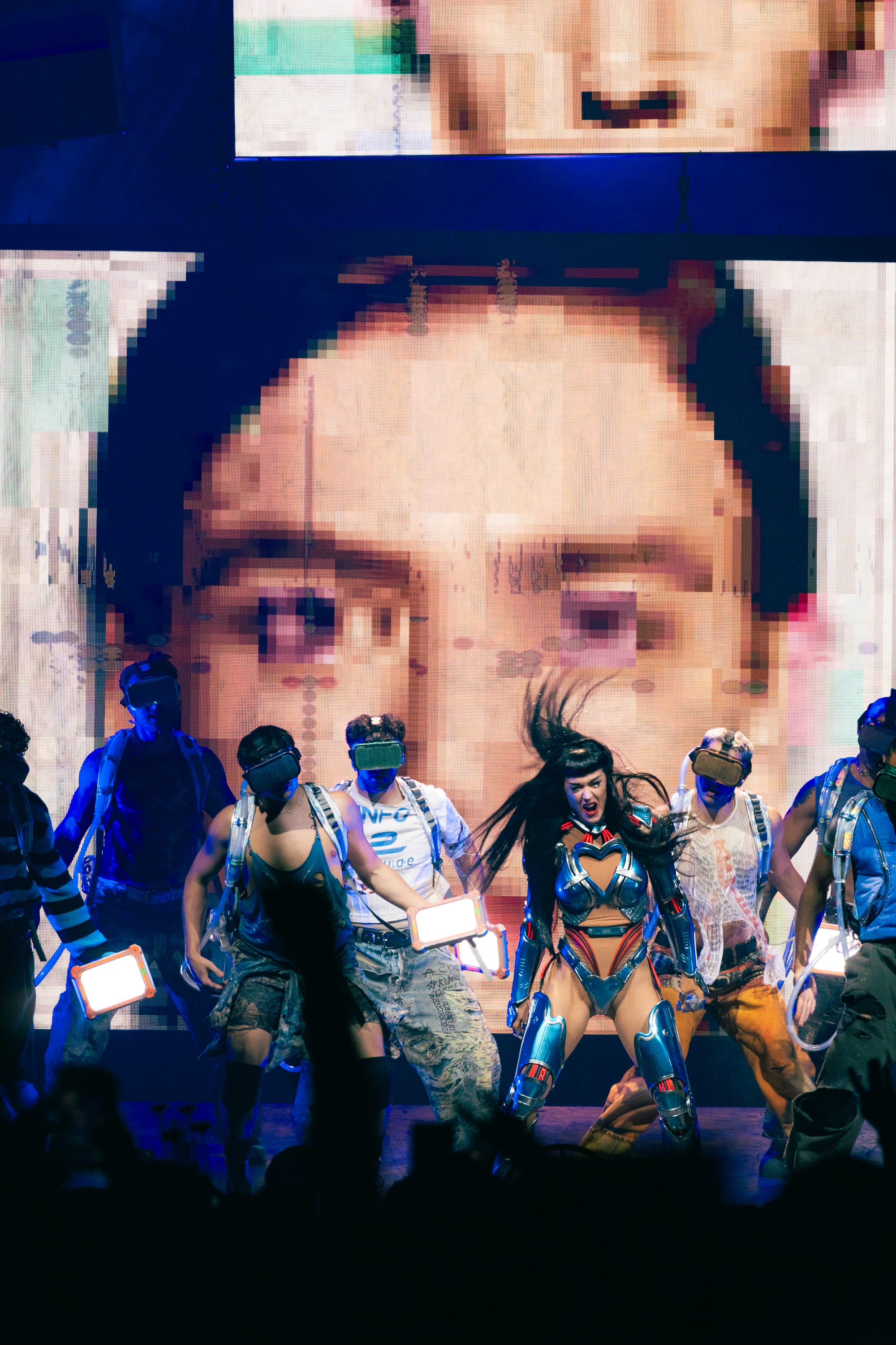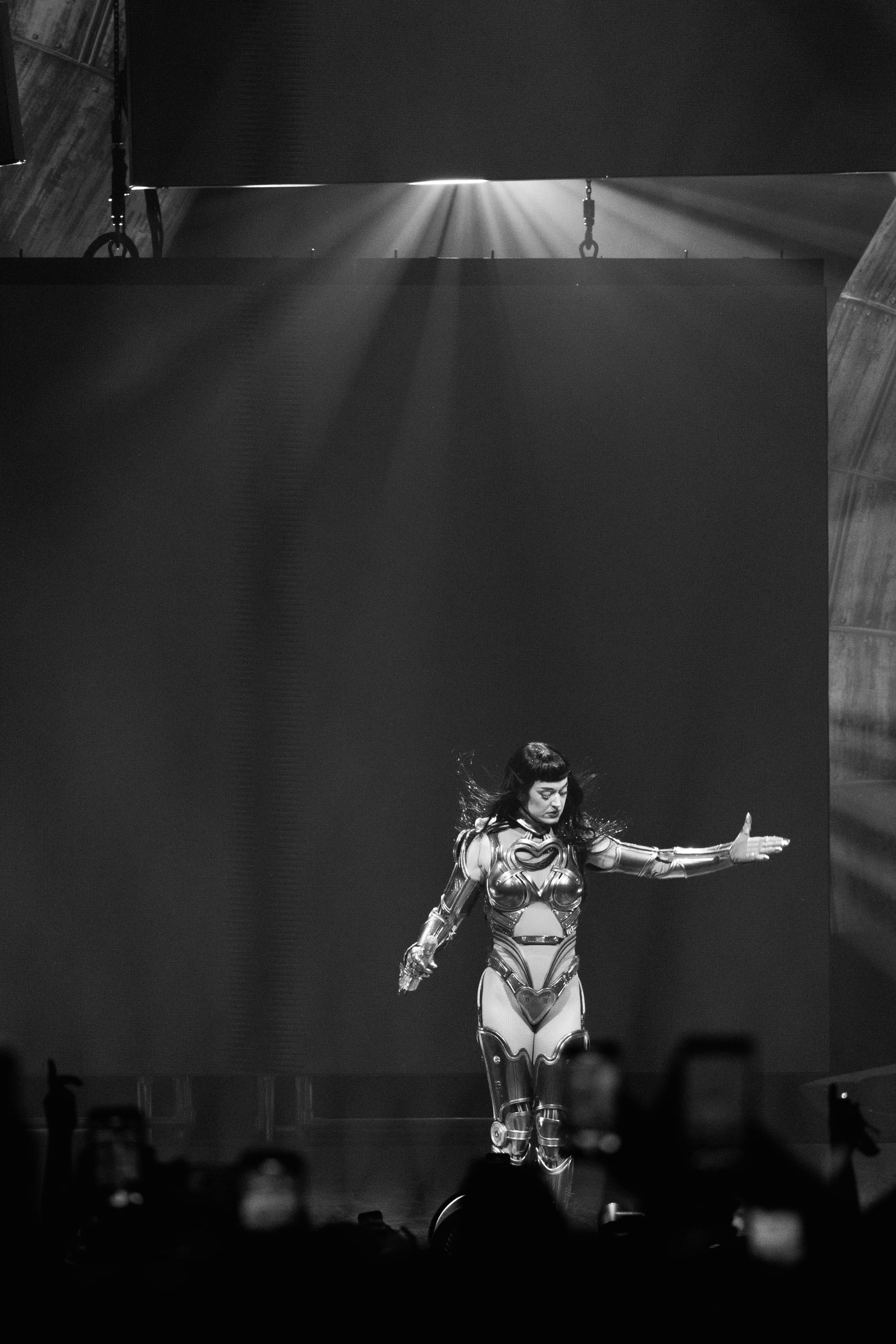 Dancers, dressed in matching cyberpunk outfits adorned with headsets, created dynamic shapes with their sharp arm movements, underscoring the beat. Perry committed to executing death-defying stunts straight out of Cirque du Soleil. She flipped across the venue on a harness to land on giant metal flower petals during "NIRVANA," interacting with fans around the venue and making every seat in the house the best seat. She flew through the sky on a metal butterfly during "Roar," and twirled up toward the ceiling in a metal globe on an aerial rope during "I Kissed A Girl."