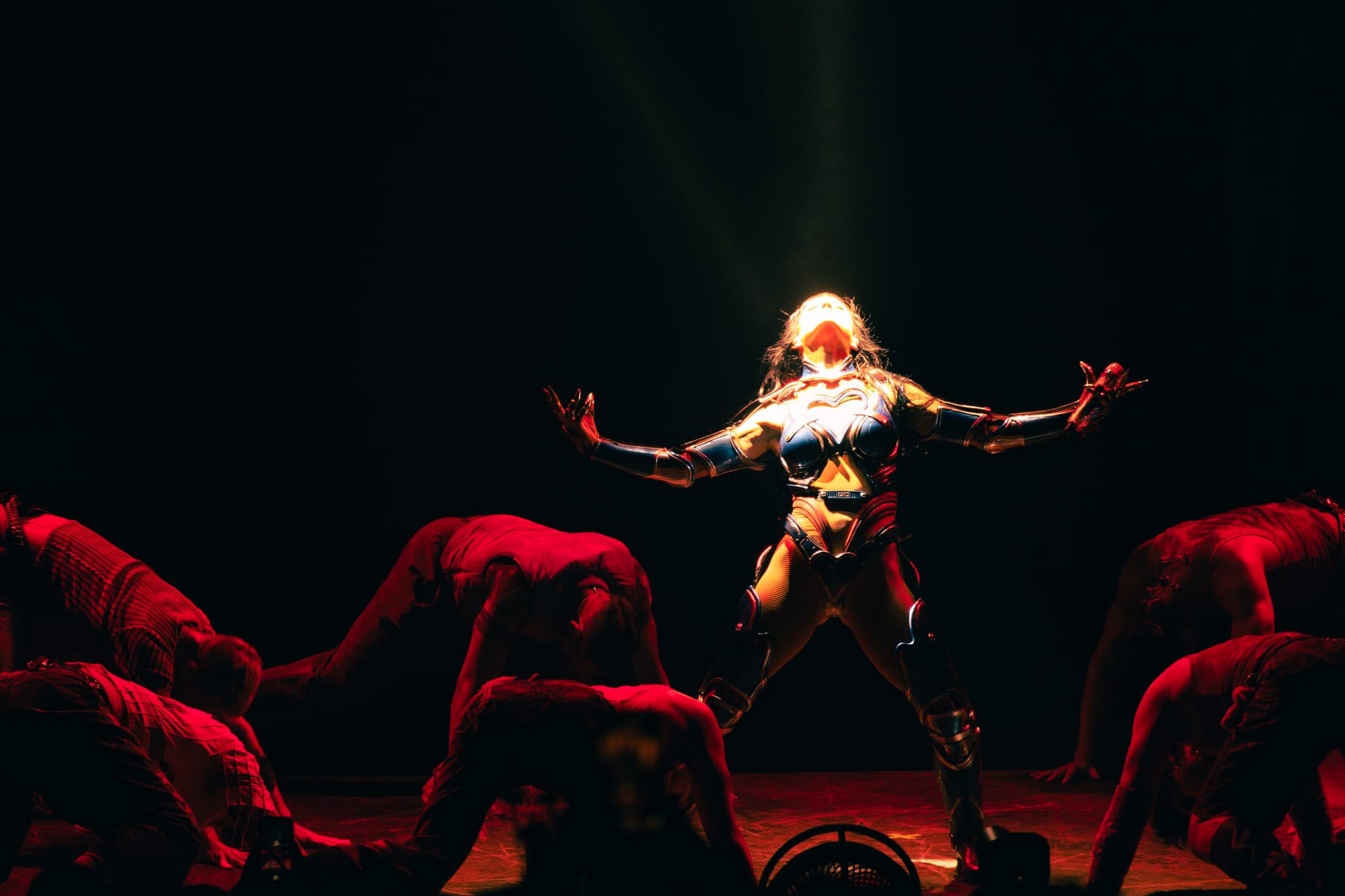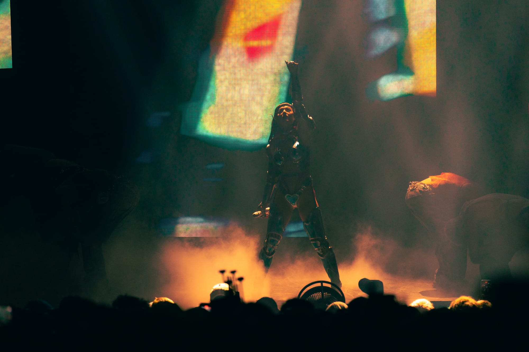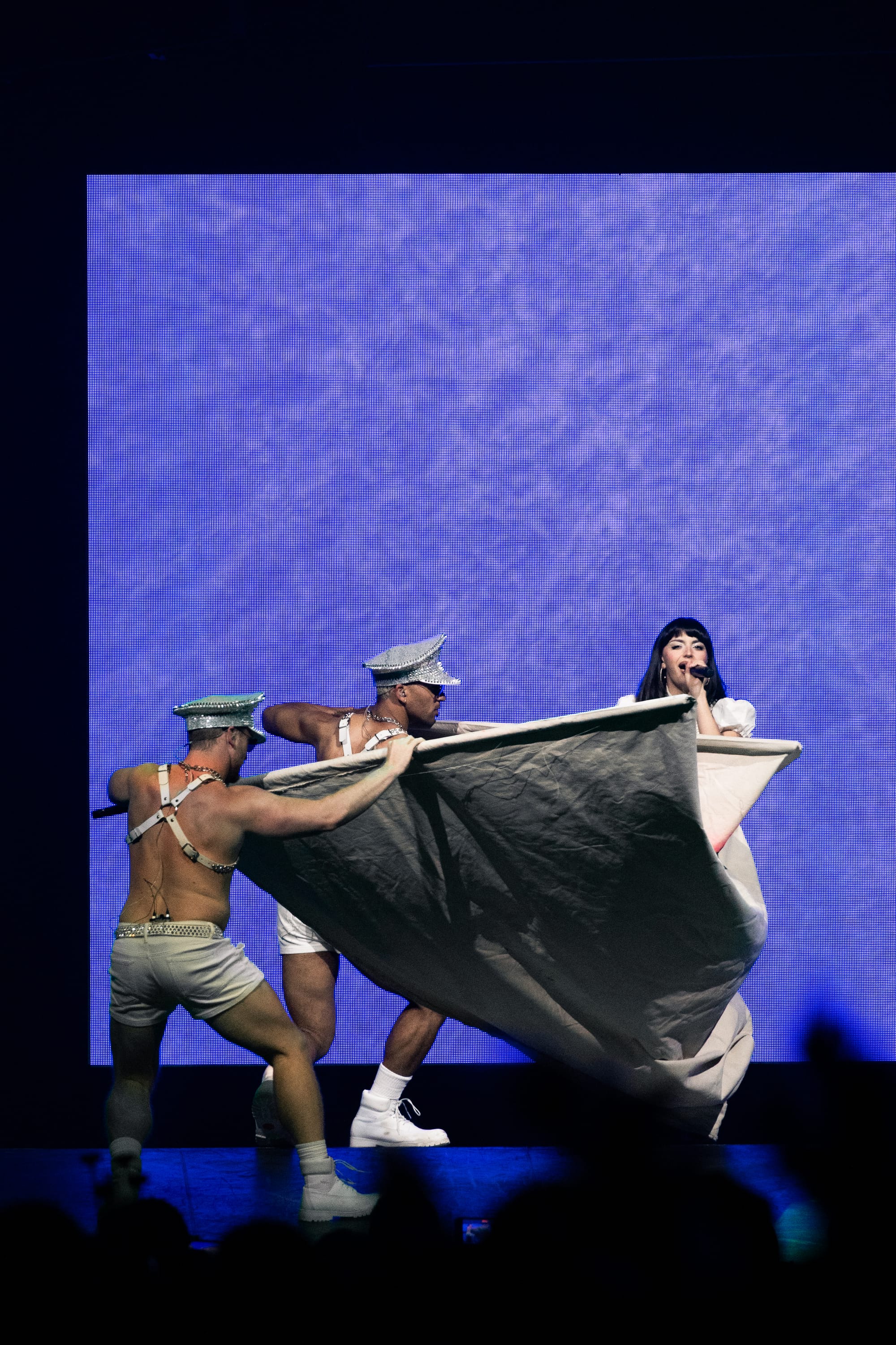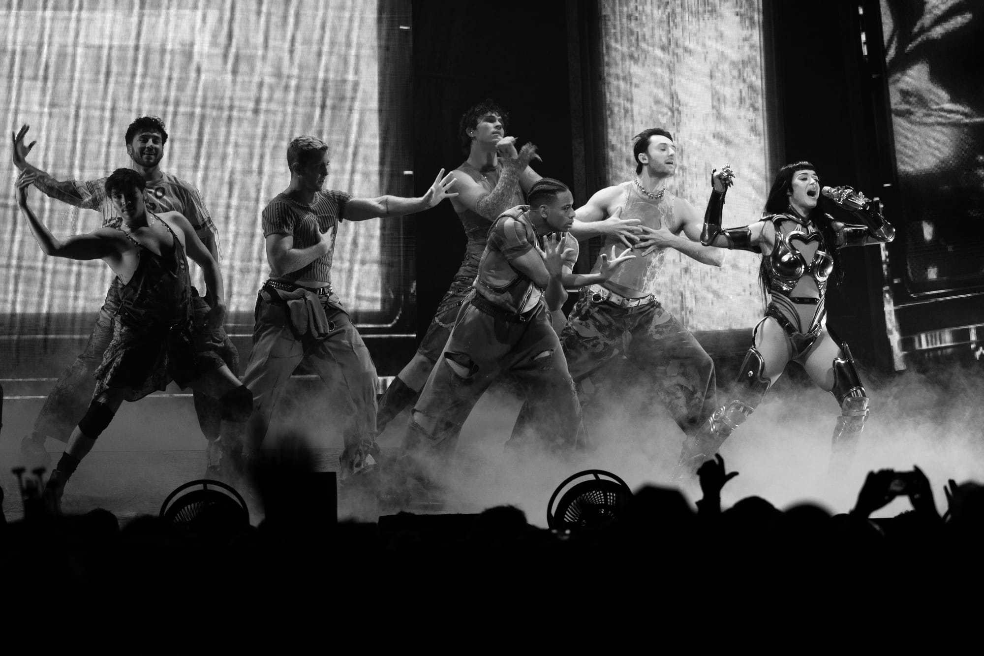 Dancers, dressed in matching cyberpunk outfits adorned with headsets, created dynamic shapes with their sharp arm movements, underscoring the beat. Perry committed to executing death-defying stunts straight out of Cirque du Soleil. She flipped across the venue on a harness to land on giant metal flower petals during "NIRVANA," interacting with fans around the venue and making every seat in the house the best seat. She flew through the sky on a metal butterfly during "Roar," and twirled up toward the ceiling in a metal globe on an aerial rope during "I Kissed A Girl."