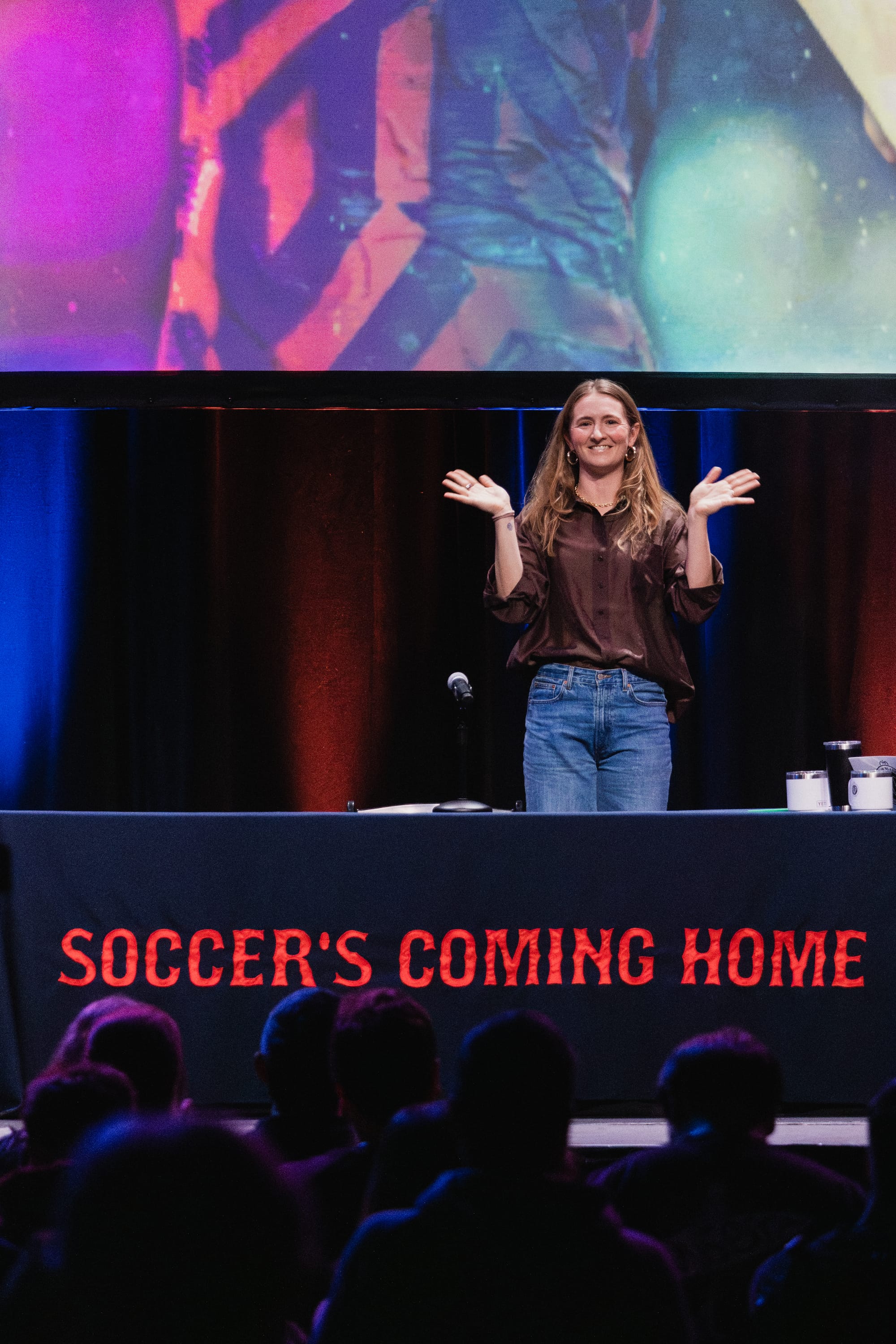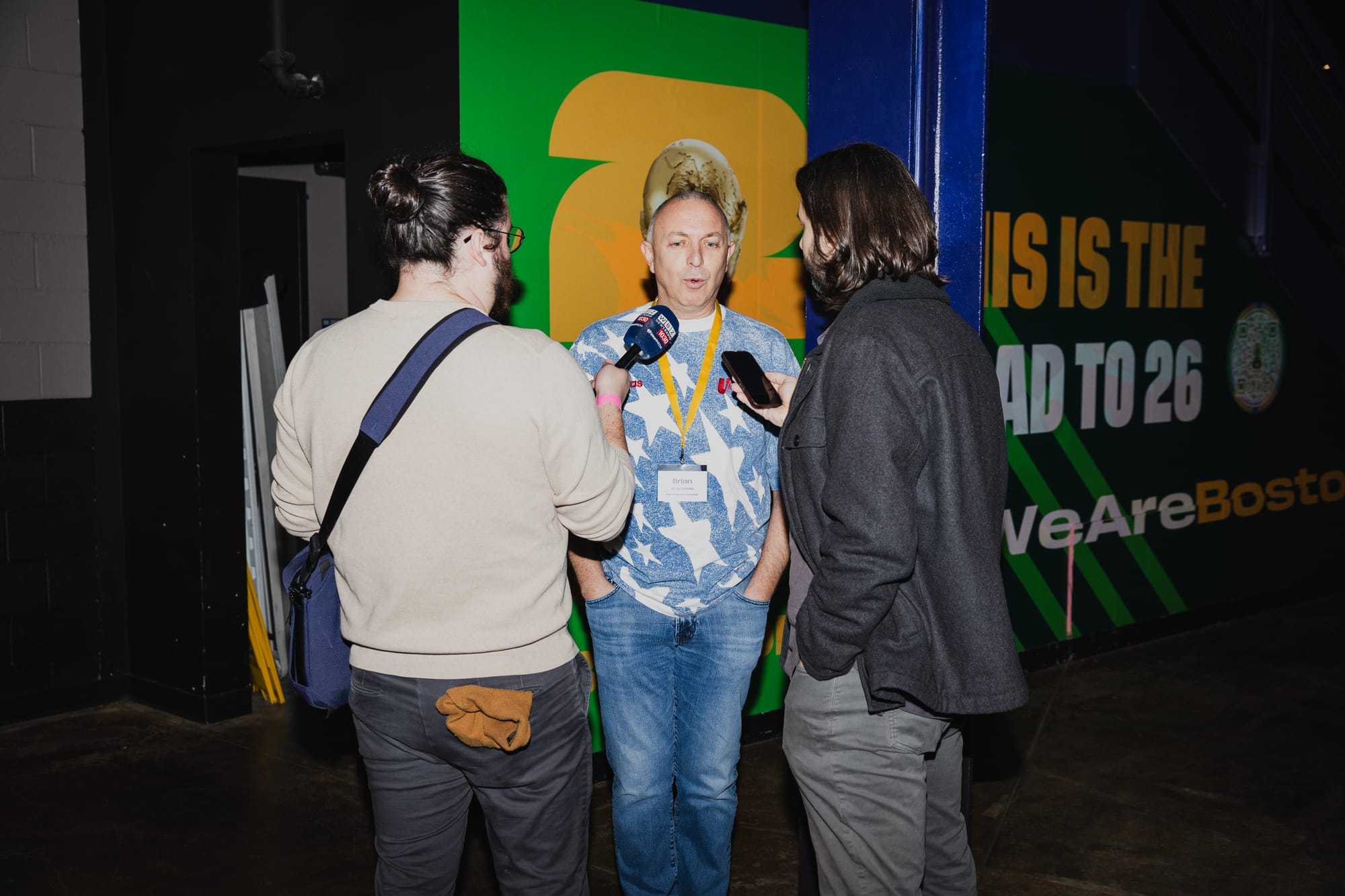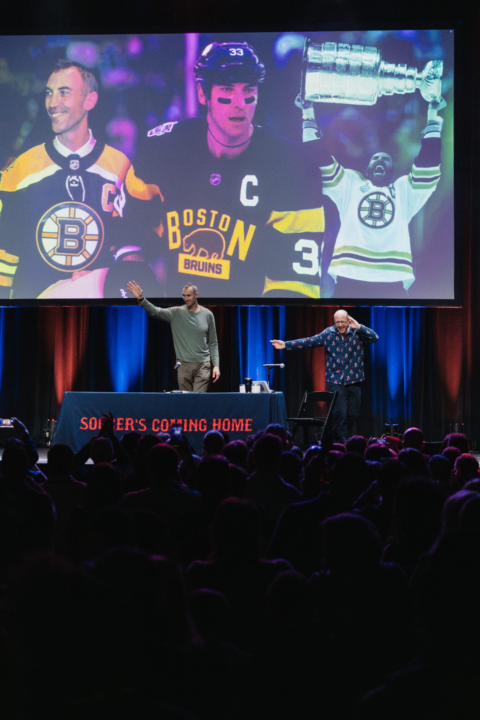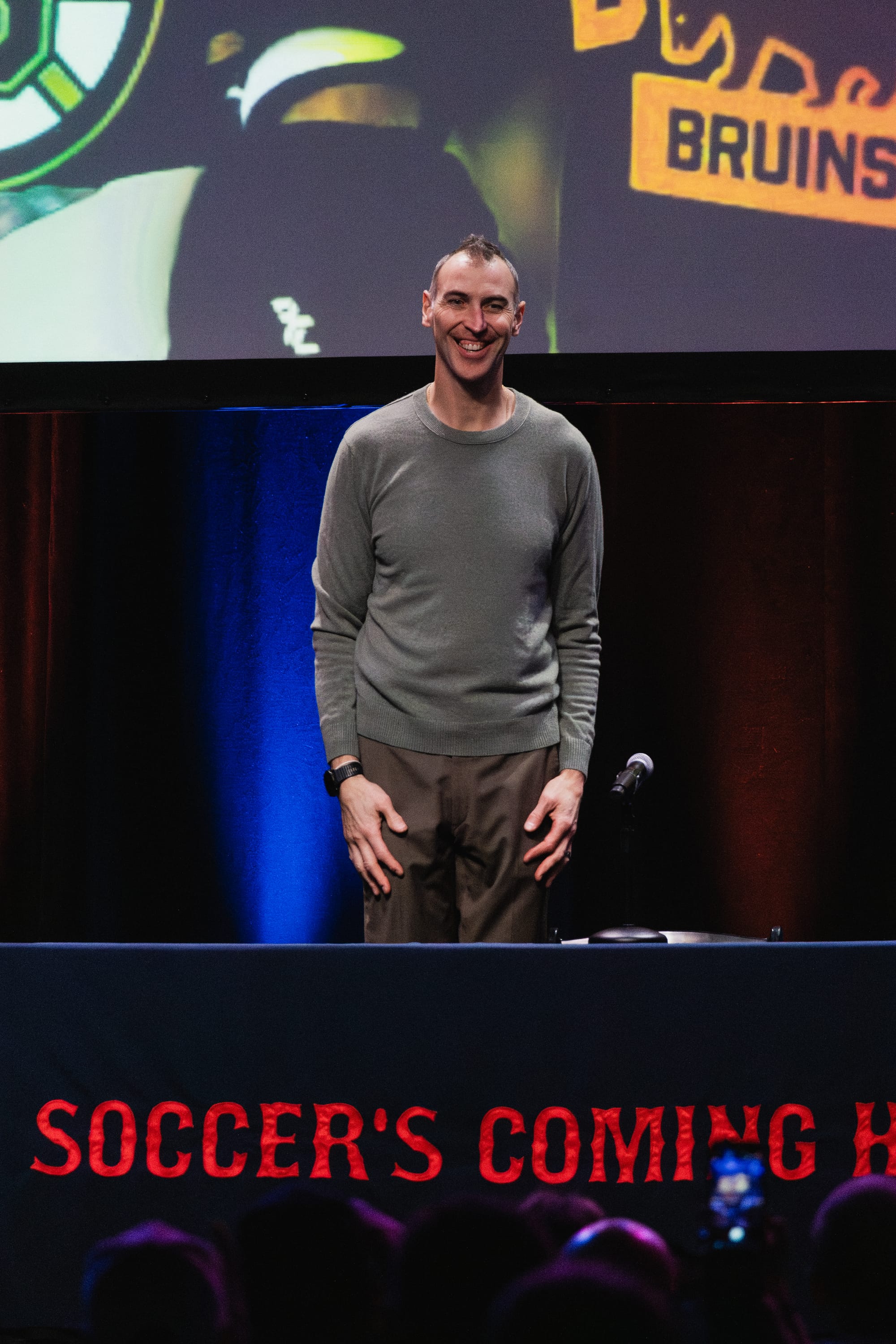 The festivities began when beloved co-creator of the Men in Blazers network and British-born broadcaster Roger Bennett (Rog) burst onto the stage. His contagious energy filled the venue as everyone stood and waved their teams' scarves. It's time to "celebrate your magical kingdom together. This singular positive joyful life force that is Boston," he said. He loosened up the audience with jokes about his youth (including the incredible hair he used to have), how much he loves Dunkin' Donuts, and how the city's semi-aquatic Duck Tour vehicles make him feel like he's right at home in Liverpool. His outlook set the euphoric, humorous, and empowering tone for the night, as he introduced a slew of brilliant guests who would share their thoughts on the year ahead.
