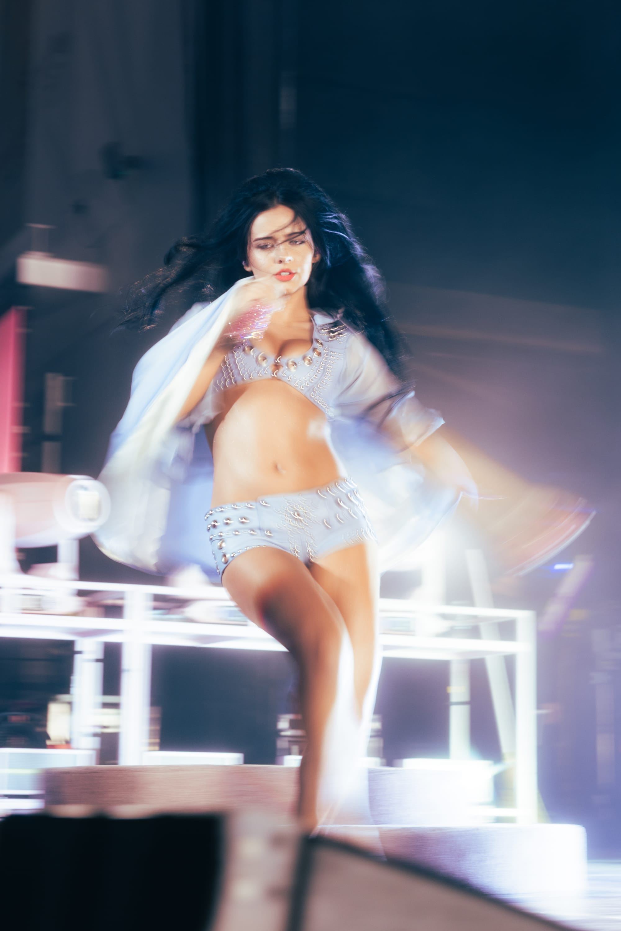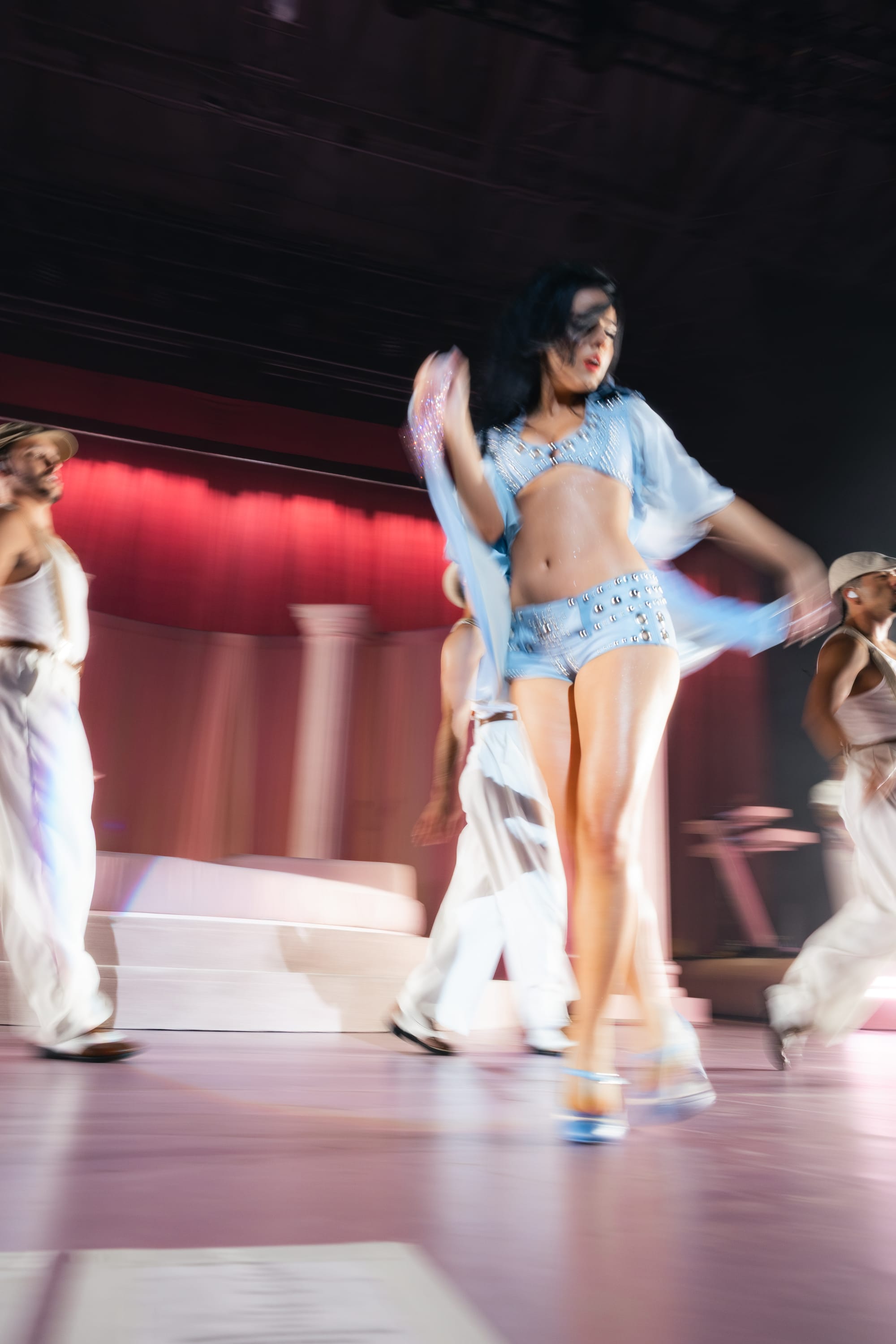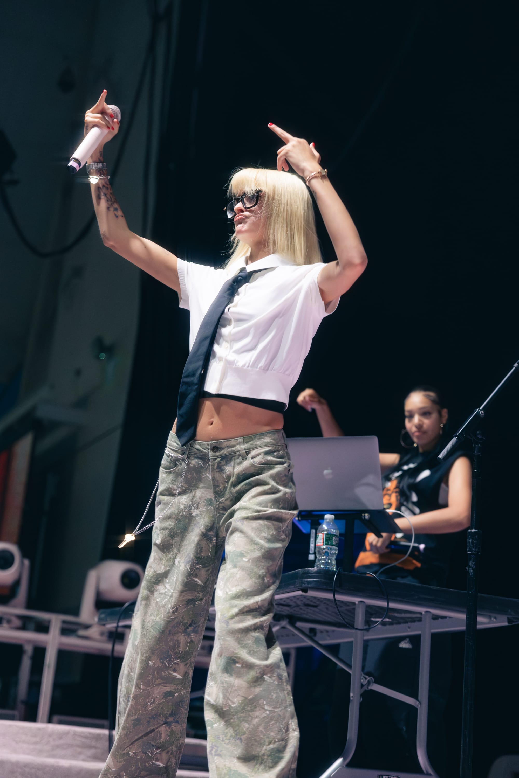 A firework show on the neighboring harbor entertained the crowd between sets and was a fitting welcome for the glamorous singer. A whimsical pink set scaled the stage, complete with columns, flowing curtains, and carpeted platforms. The lights finally dimmed, and the venue released thunderous cheers. A spoken-word intro narrated by Murph played while dancers scurried around the stage, acting out scenes straight out of a Western film battle. Her final words were "you keep taking swings at nothing, eventually you hit blood" as the lights flashed red and revealed her bouffant-haired silhouette behind the curtain. She stepped into the spotlight with a baby blue studded leather two-piece set and dove into the addictive track "Gucci Mane."