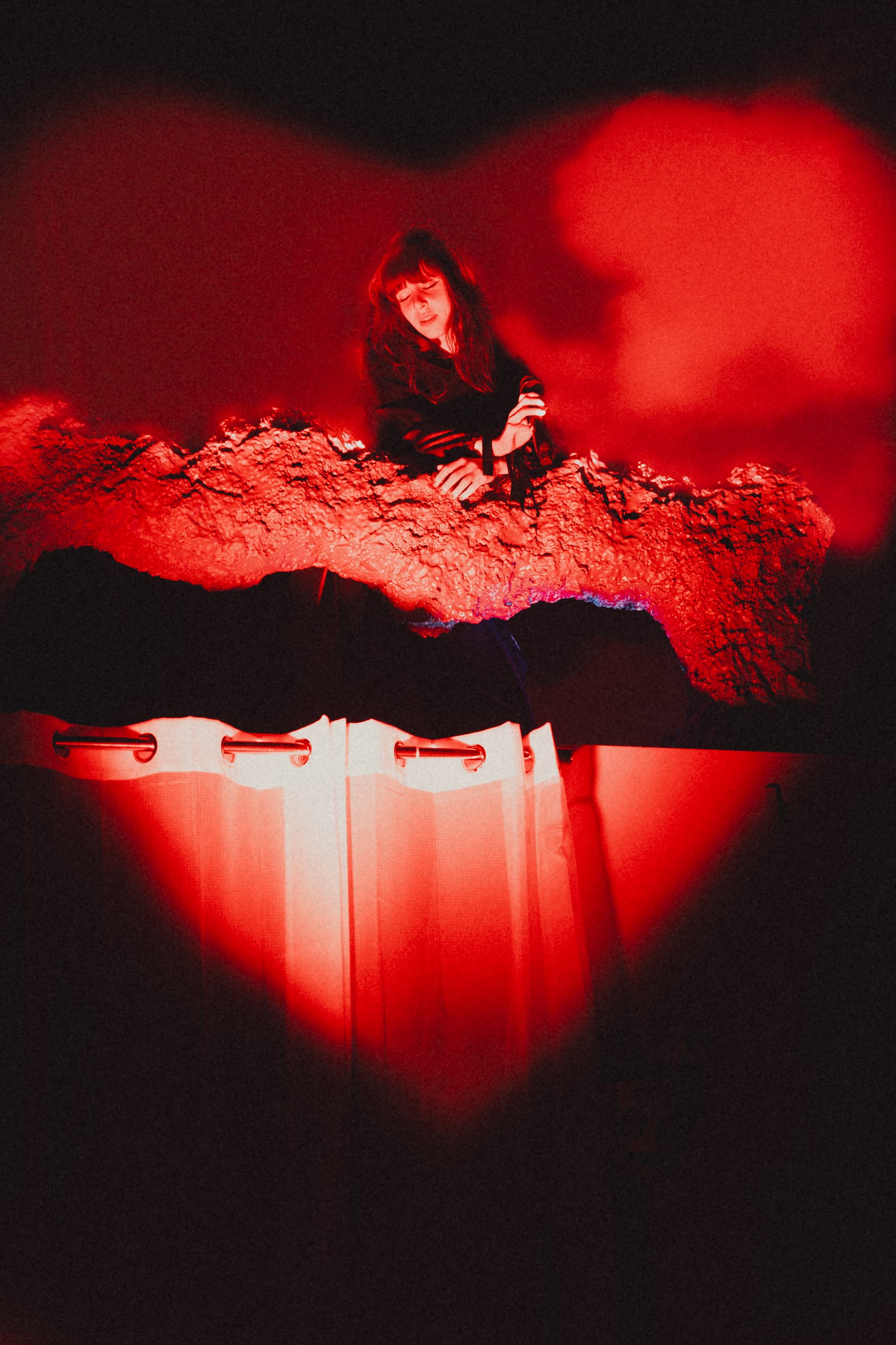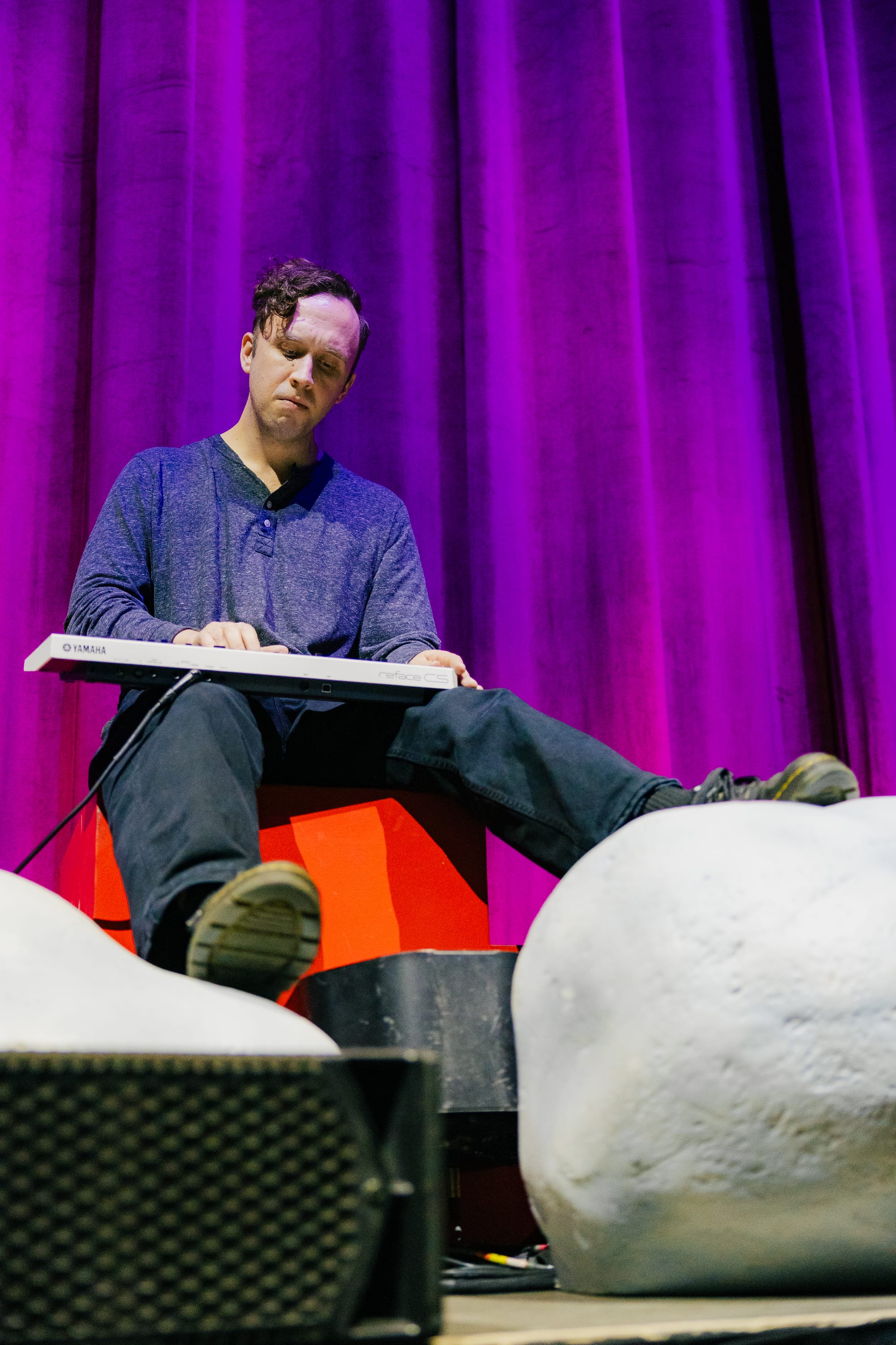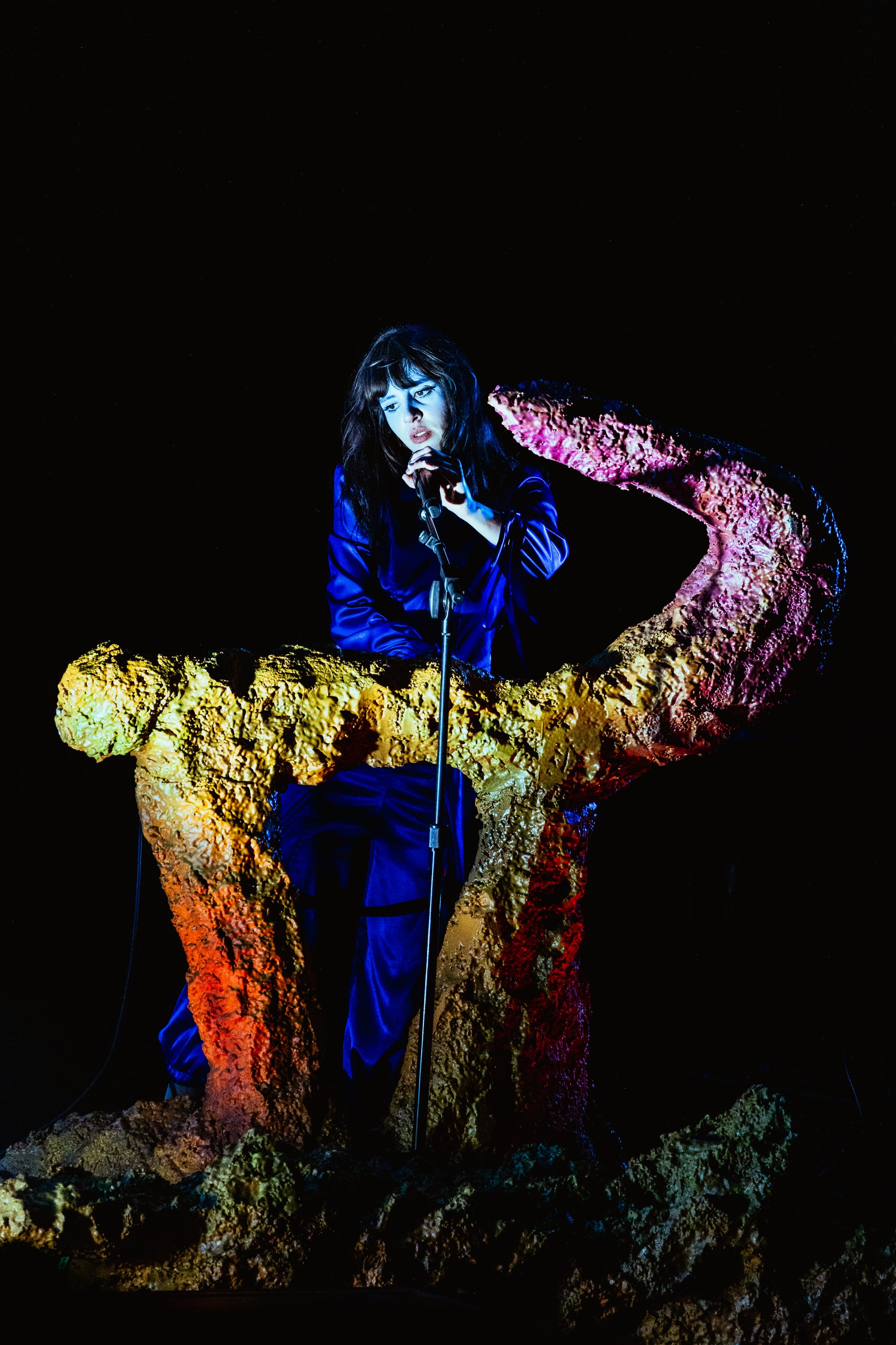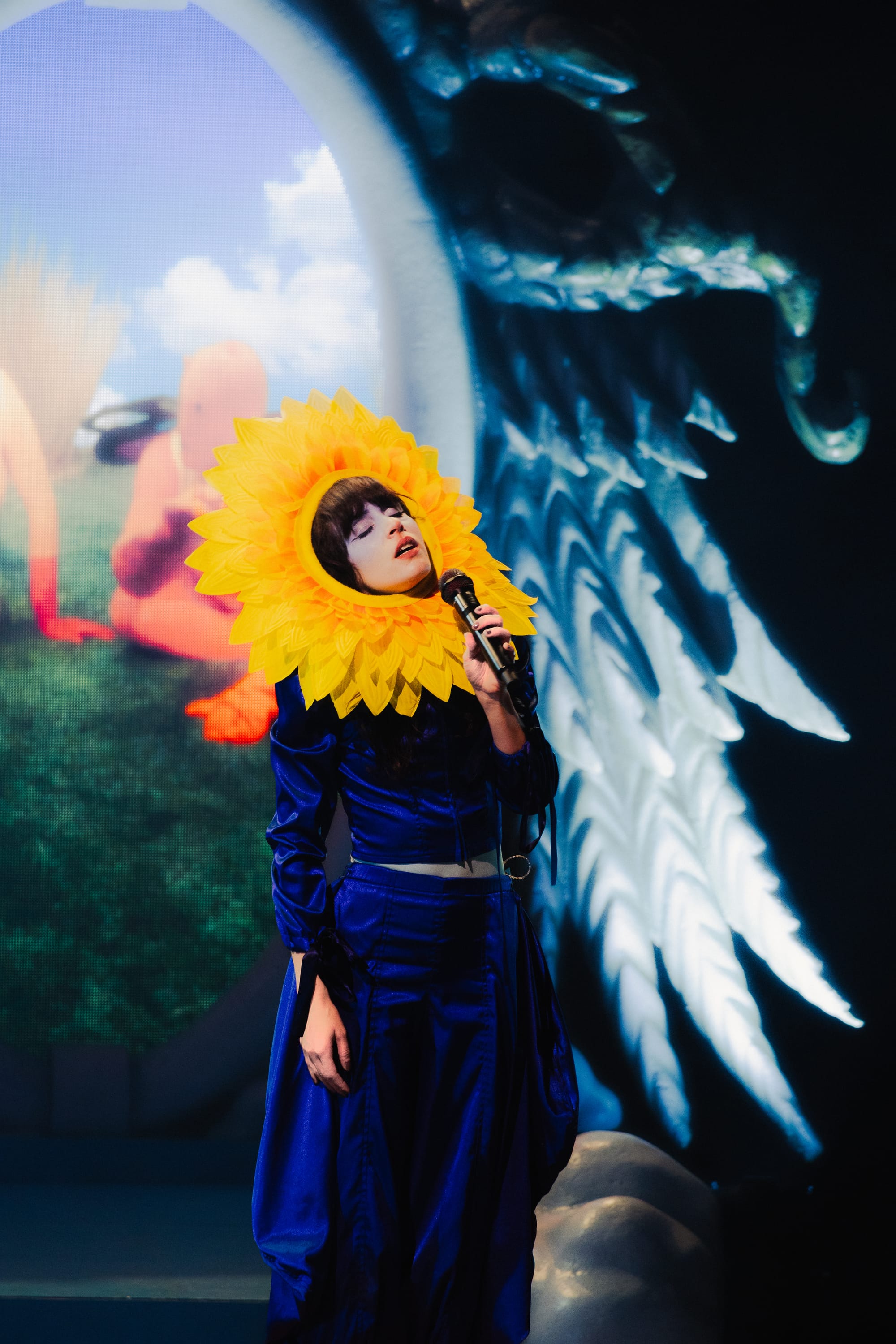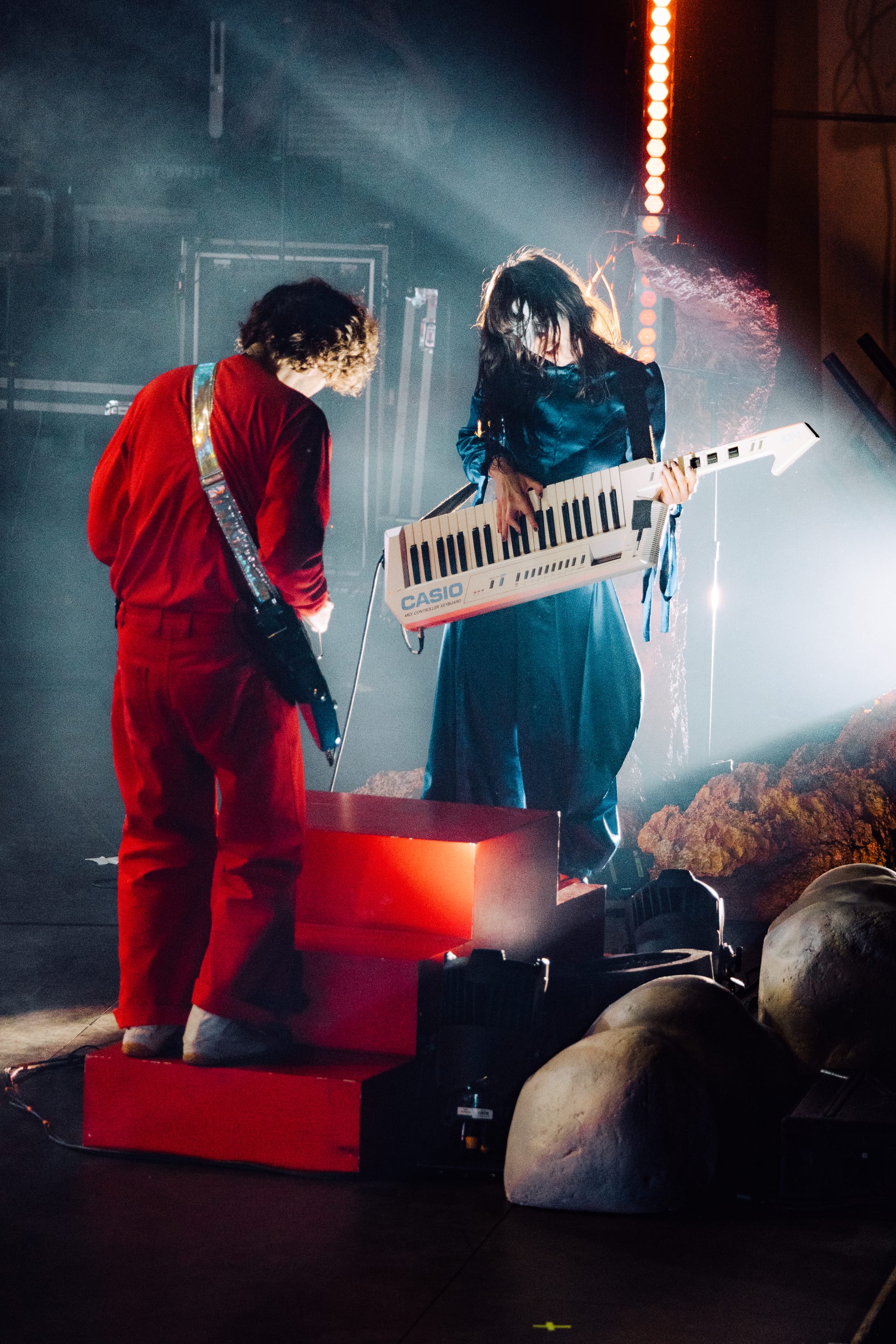Toward the middle of the set, Tenebaum began changing costumes, alternating between a large sunflower headpiece, a bug papier-mâché mask, a red silky outfit adorned with planets, an iridescent cape, and more. She grabbed a keytar, teaming up with bandmate Matthew Lewin on guitar to shred during instrumental interludes as the lights flashed. At one point, Lewin put on a red leaf-esque mask as he acted out inserting the CD into Tenenbaum's head, as depicted on the album cover. These theatrics further submerged the venue in their world, transporting them deeper into their lush, crunchy soundscapes.