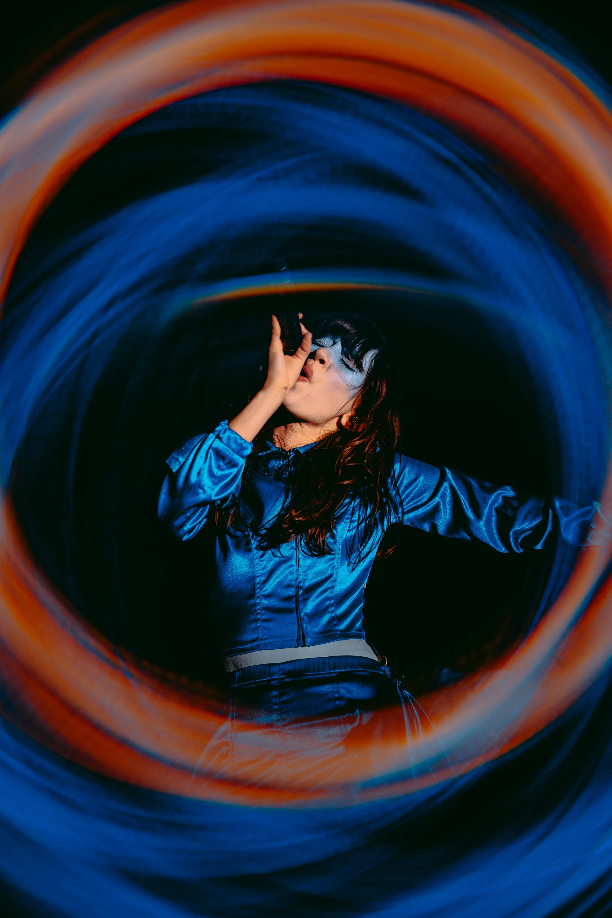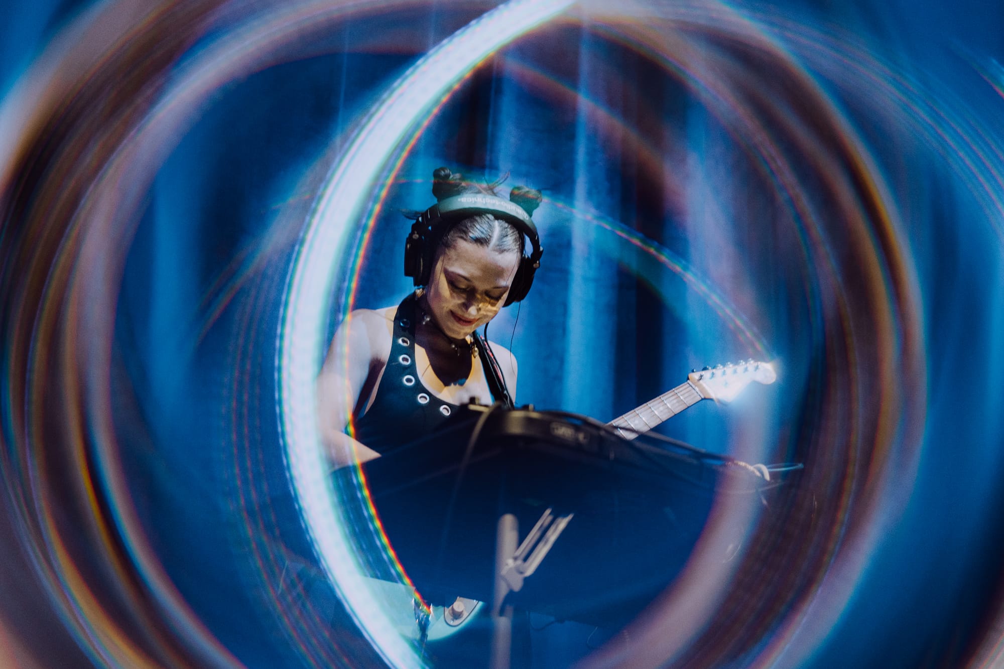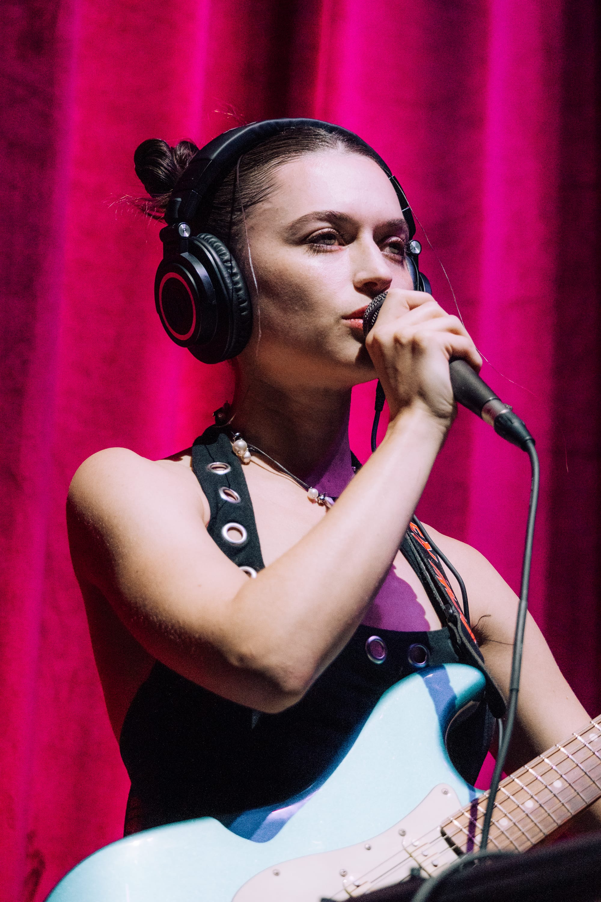 She effortlessly executed vocal flips, passionate belting moments, and softer falsetto. Between songs, she would pull back the curtain on her creative process, citing growing up as a tuna and sardines being her favorite snack as inspiration for song titles and sounds. These soft-spoken, hushed moments pulled the audience closer to her. She let the fluid, dynamic music speak for itself during this stripped-down set. While operating the midi controller, she also played an electric blue guitar with an Iron Maiden strap. Techniques like using a filter to make her voice sound like a distant voicemail added intrigue, warmth, and texture to her performance.