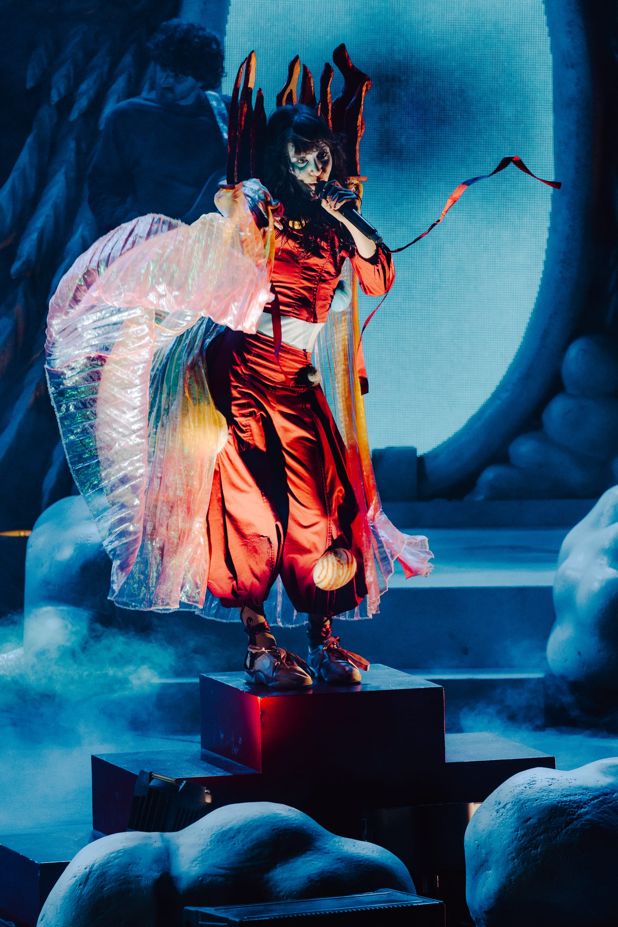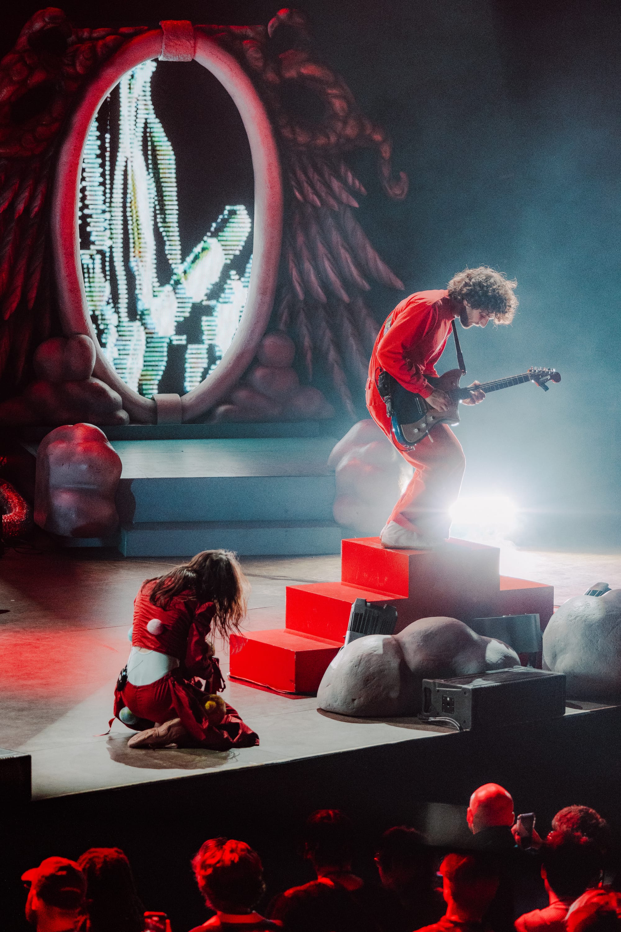 Soon after, the curtain dropped, revealing Magdalena Bay's grandiose, maximalist, and colorful set. They made the tour bigger and even more mysterious with these upgrades. The stage featured the classic red stairs, a biblically accurate angel eyeball with wings, an LED screen window with curtains, and a costume rack. But this time, the screen inside the angel wings was twice the size, and on top of the costume wall was a secondary stage with textured papier-mâché rails reminiscent of bright coral reefs.