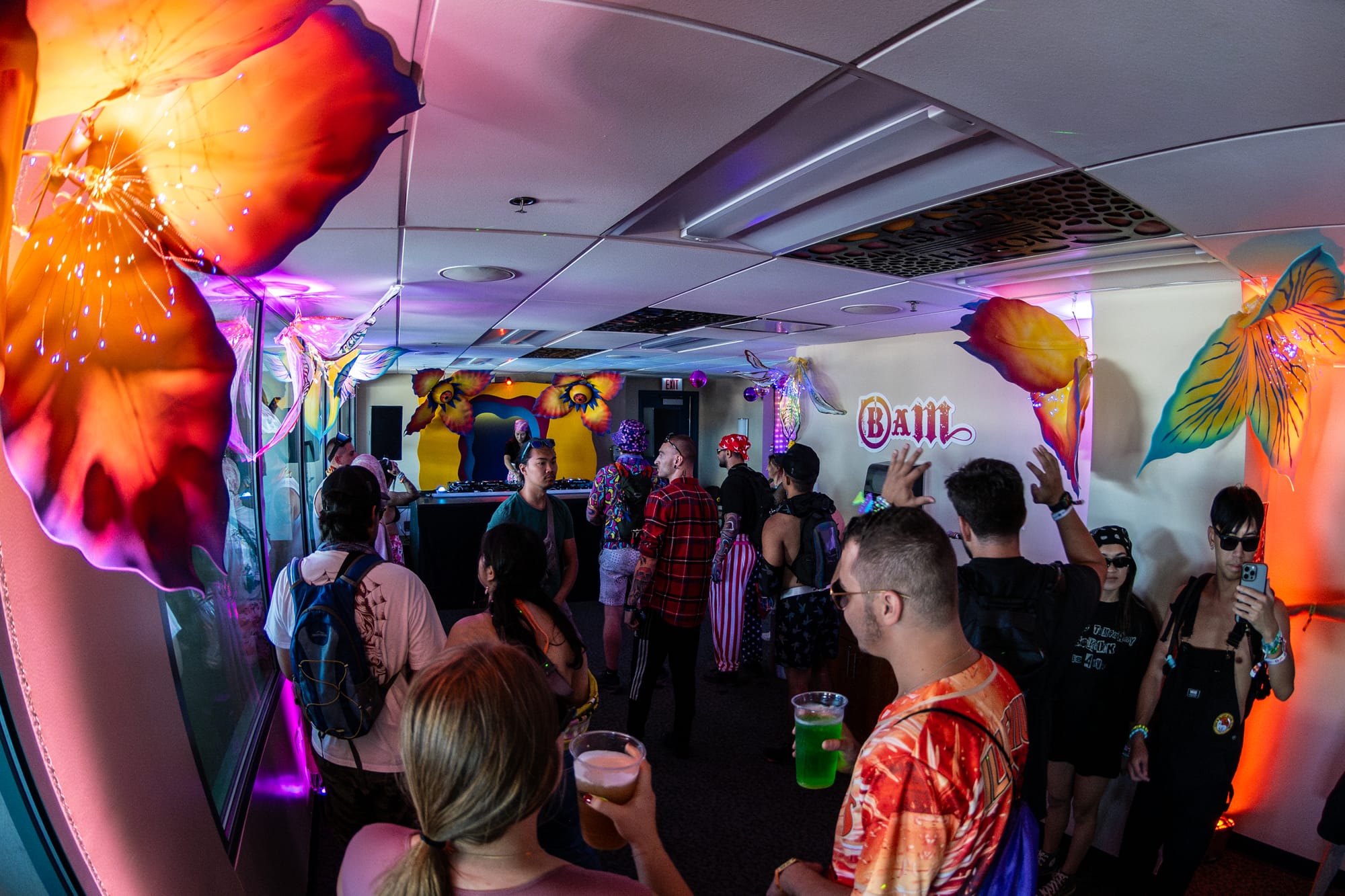 I got to the festival earlier than I had the previous days and I realized that I hadn't popped into Club Coast at all. After walking down, a long colorful hallway and reaching the room at the very end I found Abae who had just started her set. The club provides an overlook of the main stage floor as you step out onto the balcony outdoors. On the opposite side of the DJ booth there was a small bar and in the corner of that section there was an interesting installation that looked like you were coming out of an alternate dimension that attendees were taking photos in. The discrete section of the festival was decorated with various neon lights and vibrant lit up large flowers hung from the tops of the walls and ceilings.