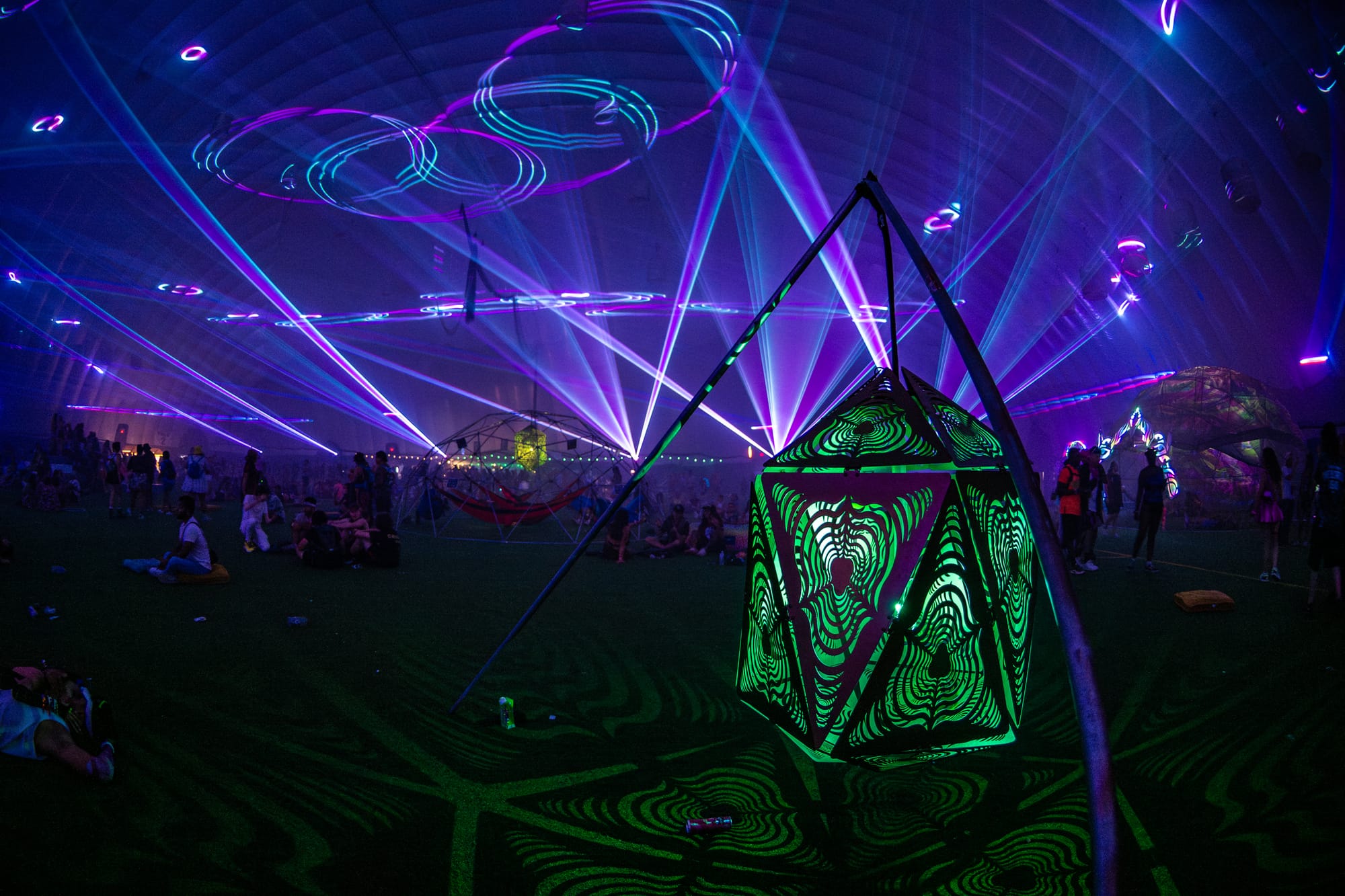 I continued to veer left and past a small dome that was set up and away as a semi-isolated relaxation area and noticed two more new visual installments following it, one of which I had seen on the festival's Instagram page earlier that day and was looking forward to finding. It was a piece by Chris Dyer and it had a light beaming on it that gave off a psychedelic look. It changed colors and looked like it was moving, I wish the photos would do it justice but they don't. Before that, was another visual display where both the framework and the actual artwork moved and changed color in a mesmerizing manner.