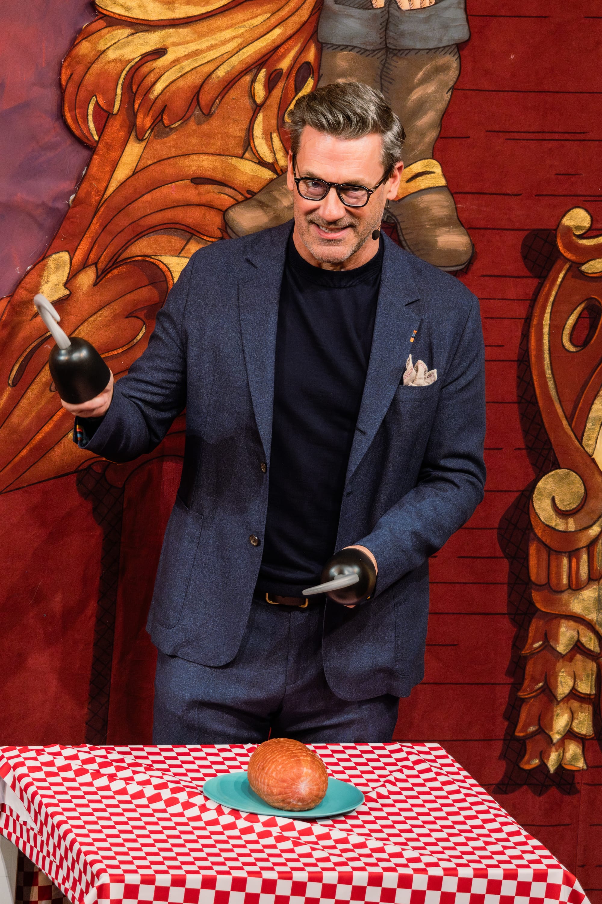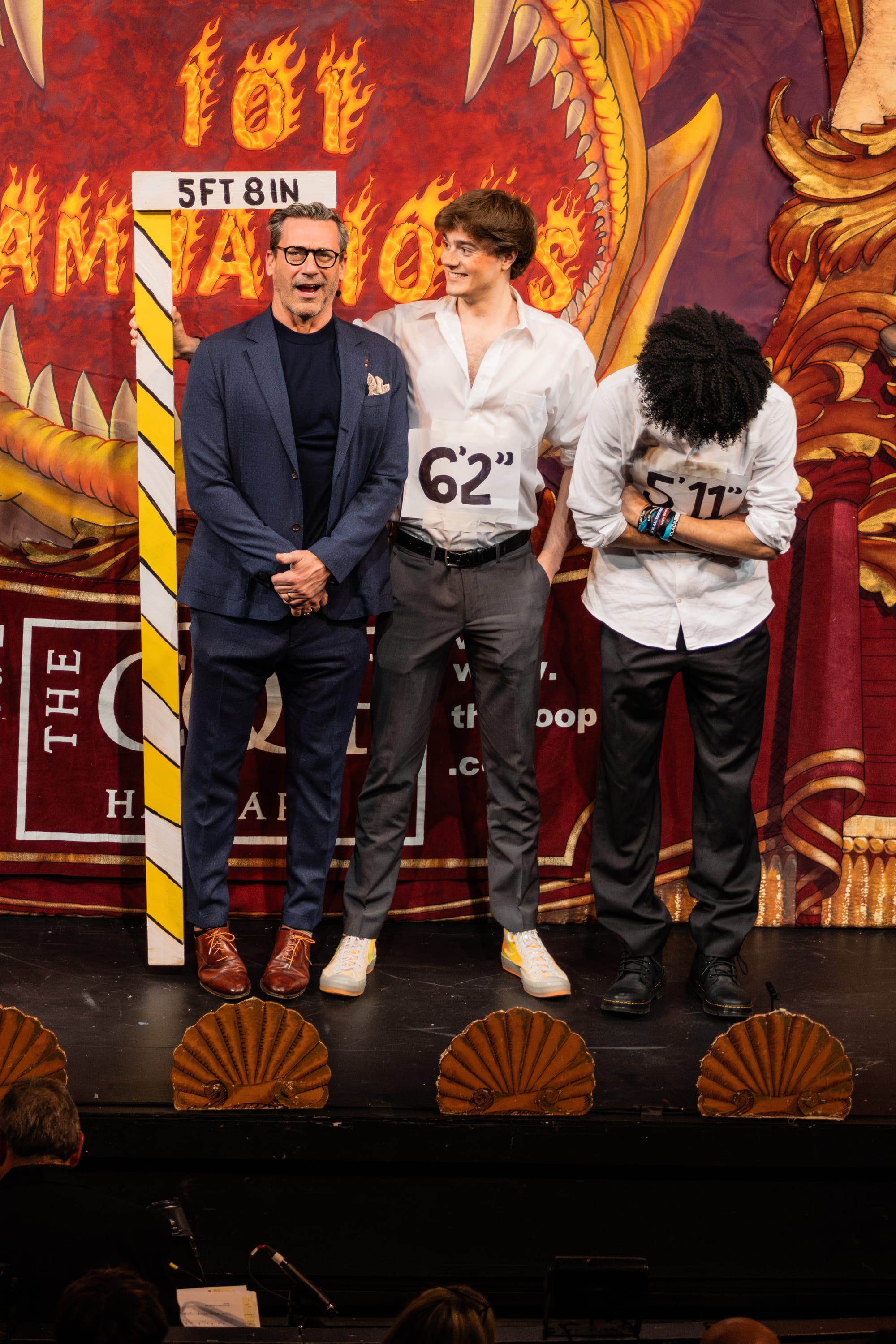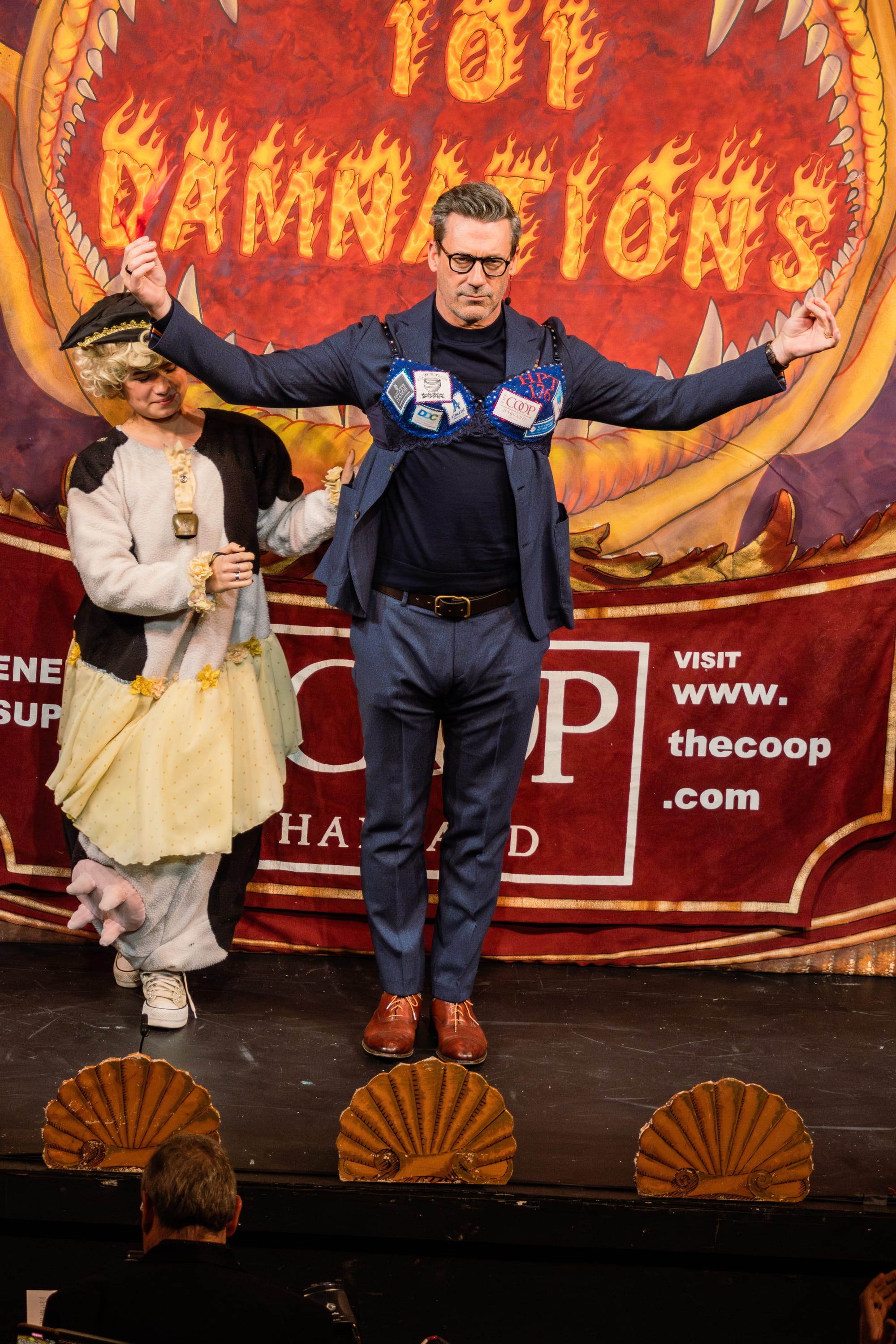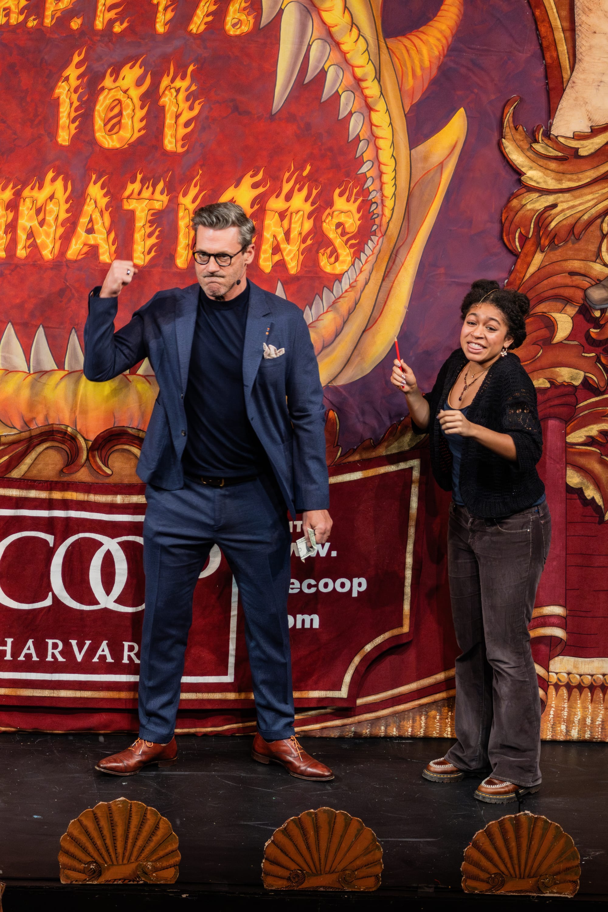 The night began with a celebratory roast. Guests clearly received the cocktail attire memo as they spilled into the theatre dressed to the nines. The lights dimmed, and head sphinx Andrew Farkas introduced the crowd to the Man Of The Year tradition. He warmed up the audience, throwing in some jests about his and Hamm's last names, before inviting The Pudding's President Cathy Stanton '25 and Cast Vice President Bernardo de Moura Sequeira '26 to the stage. Hamm took each tease with pride, crafting clever retorts on the spot. They challenged his 6'2" height claims with a bogus measuring stick, asked him to sell ordinary objects like a pen and an insurance plan to a baby who drives, and had him carve a ham with pirate hooks for hands.