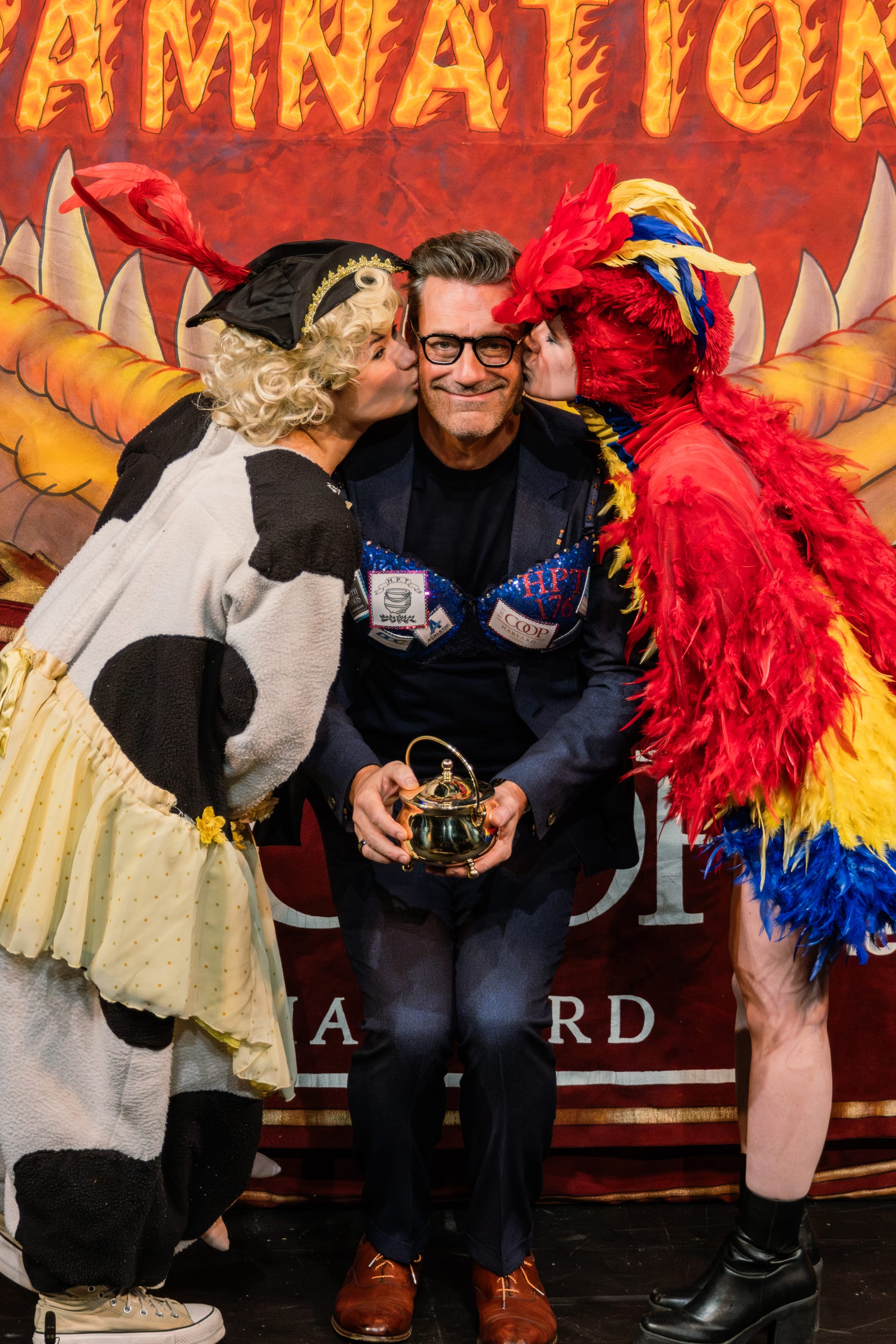 The roast concluded with the presentation of the Pudding Pot and decorated man-sserie by Ava Pallotta '25 and Jessica Zisk '25. The presenters sported a playful pirate cow costume and intricate feathered parrot outfit, dressing Hamm in his man-sserie before hitting the classic photo-op pose and kissing him on the cheek. The crowd released thunderous applause and cheers, affirming Hamm was the consummate choice for this year's award.
