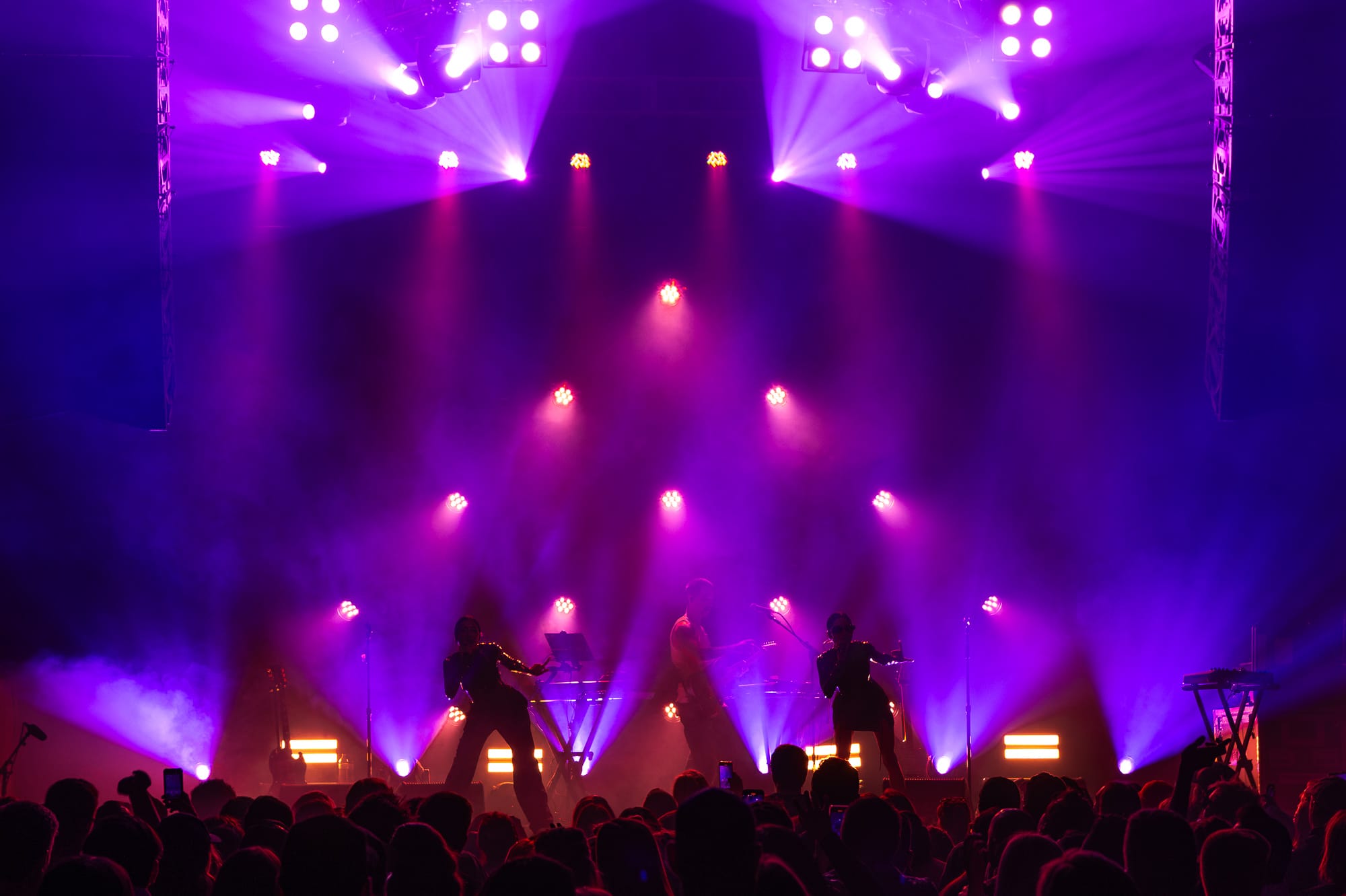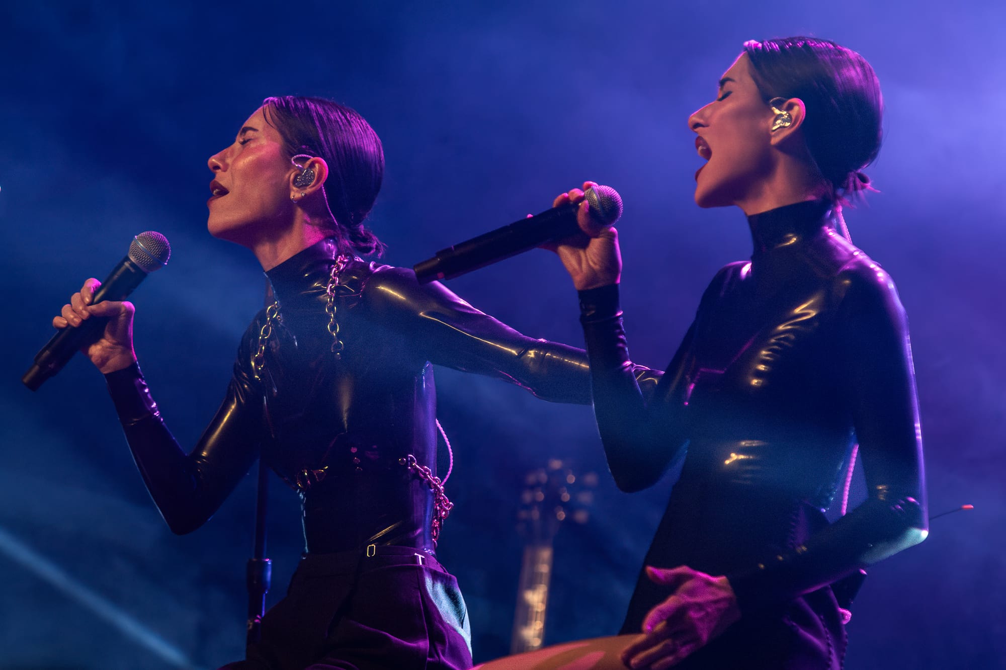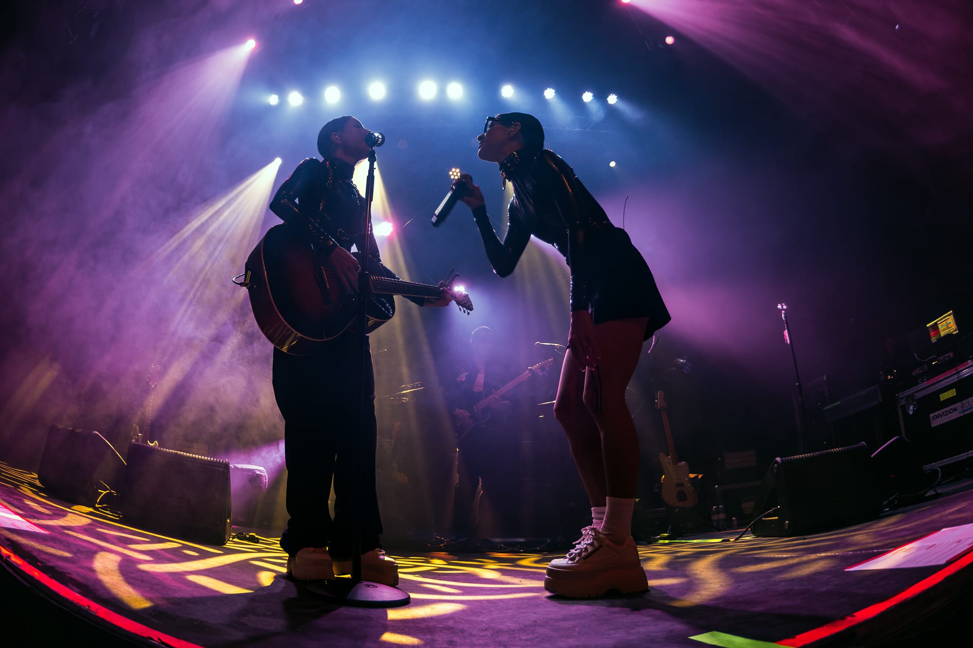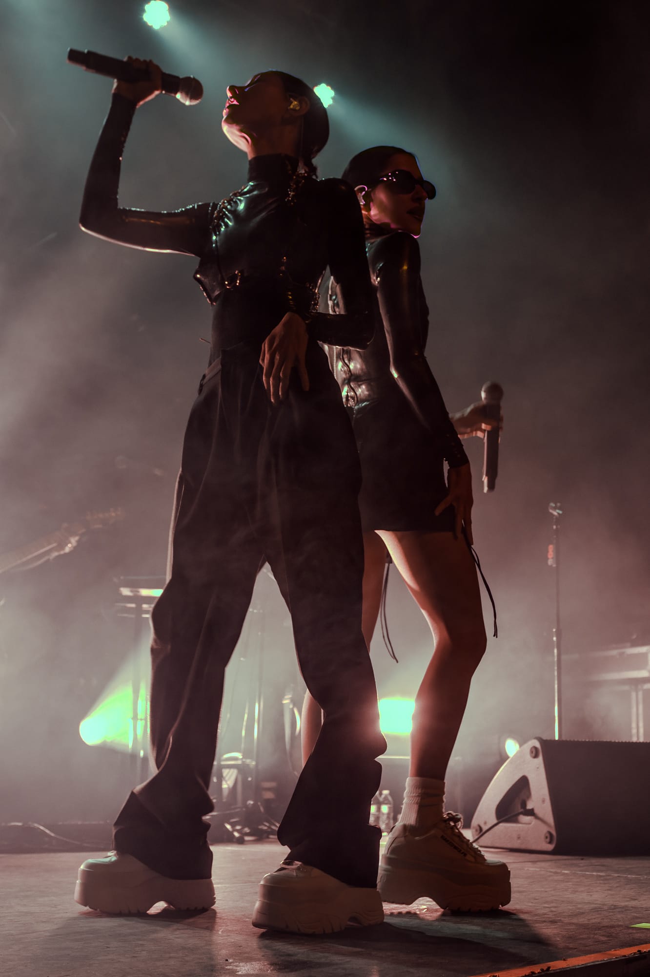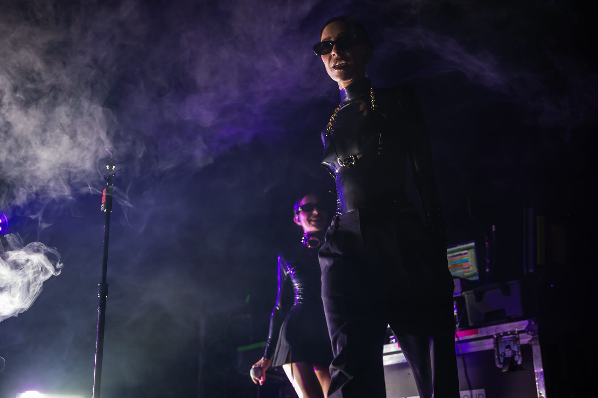 The stage crew jumped into action by clearing the stage and replacing its contents with the remainder of items for The Veronica's set. The set had already revealed a large lighting structure that sat at the very back of the stage; a large triangular shape with lights throughout the middle connected in a way that created diamonds throughout the inside, holding lights where each corner met. What seemed like a simple set up felt like forever while all of the attendees waited for the Australian duo and chatted amongst themselves in the crowd. At last, the overhead music and lights faded out and not a minute after the girls walk out looking like they just came from The Matrix. The twins both wore black and had sunglasses on - a spandex top, one with a black skirt and the other with black pants. Purple lighting illuminated behind them, accentuating even more of a bad bitch vibe between the two. These girls meant business and they were ready to give Denver an unforgettable show.