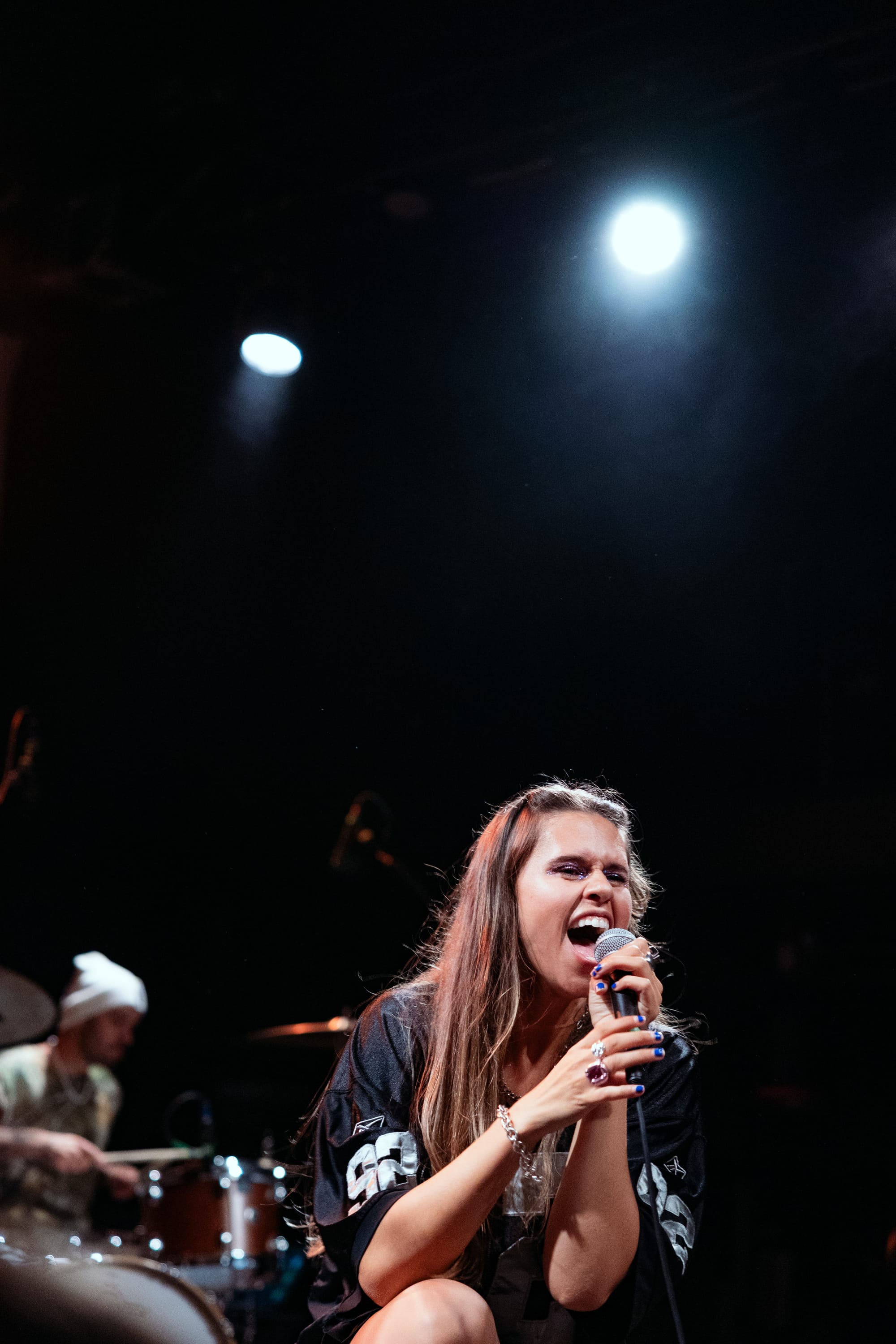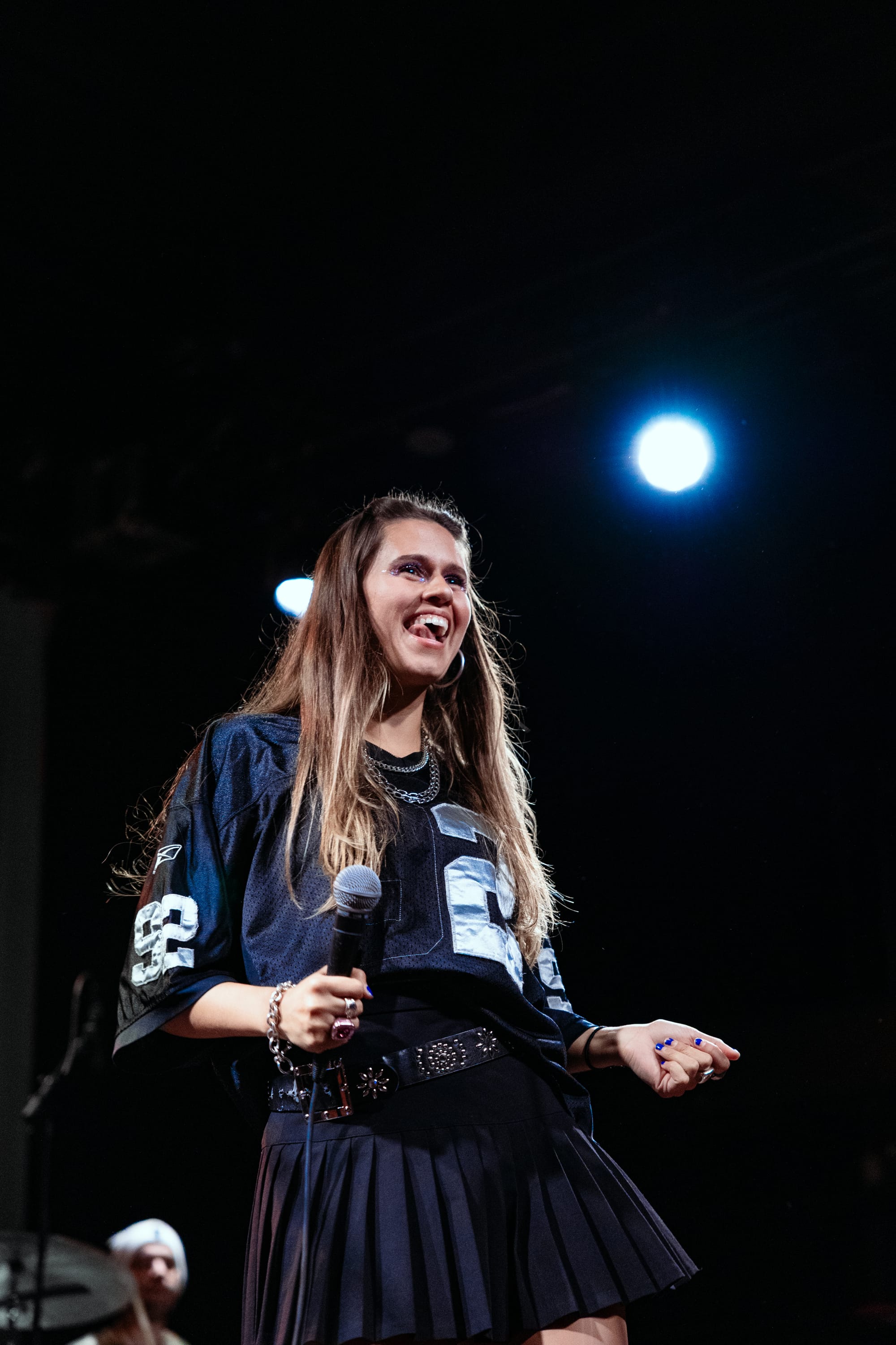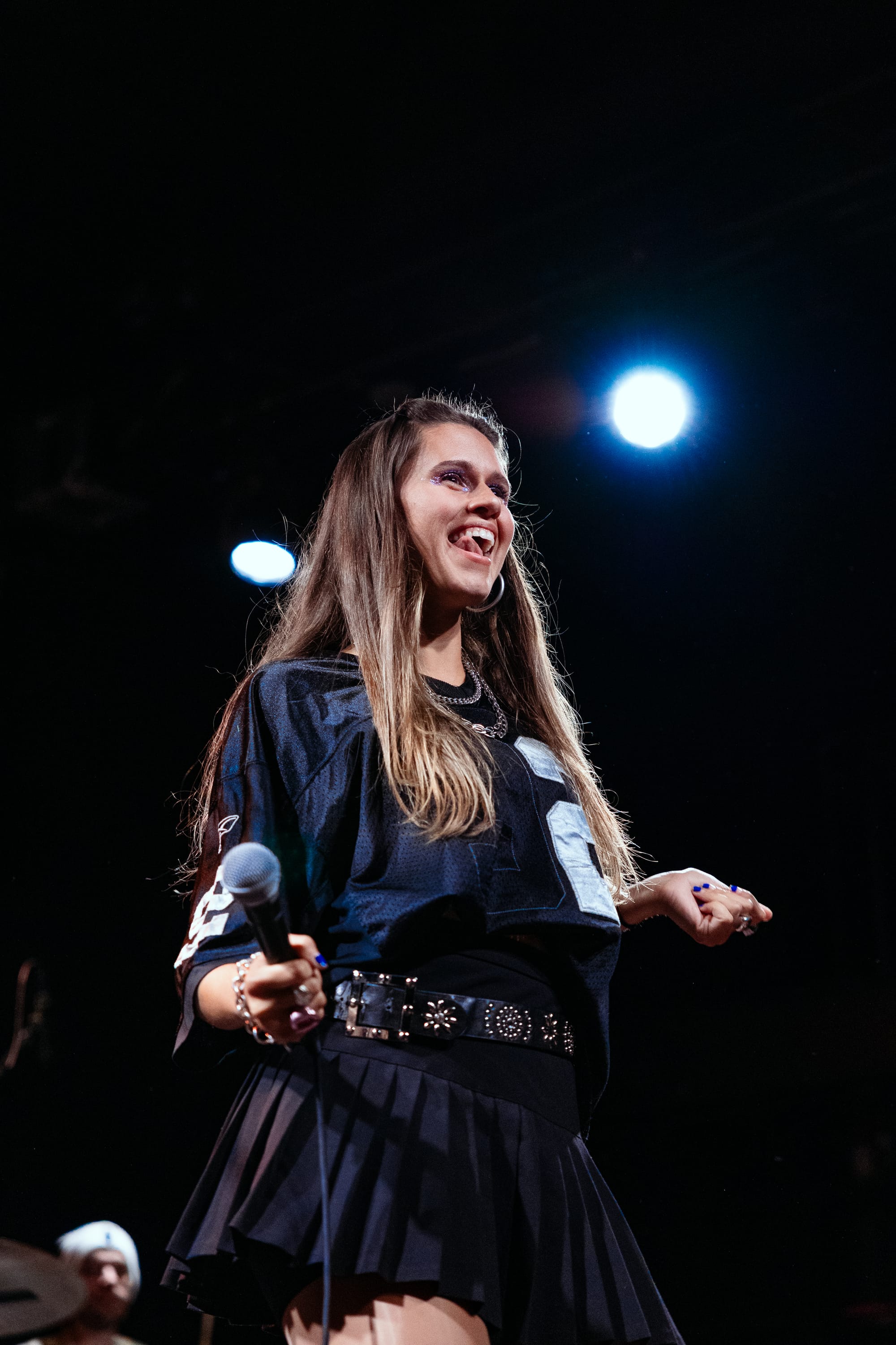 The standout track "Don't Tell The Girls" especially energized the venue and was an excellent example of her imaginative songwriting. The song explores the sticky situation of reconnecting with an ex. Lyrics like "Don't tell the girls that I spent the night at his house / He was the worst so I'll never live this down" invited the crowd to feel like a part of this secret, creating a shared closeness and a memorable impression on fans who may not have heard of her before the show. She also naturally interacted with the crowd. At one point, a fan handed her their phone, and she excitedly grabbed it to record on the stage. She flawlessly executed call-and-response moments and paused to share relatable anecdotes about her "shitshow love life" before the song "I Don't Get Breakups," exhibiting her gutsy and go-with-the-flow performance style.